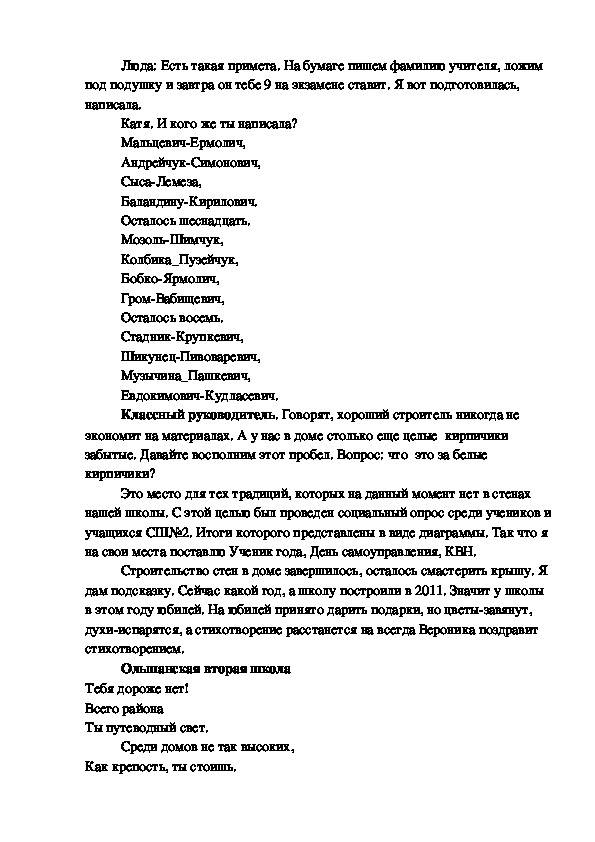 Катя: А как?Люда: Есть такая примета. На бумаге пишем фамилию учителя, ложим