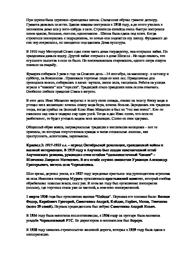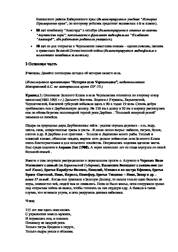 Представленные материалы могут быть использованы для проведения классного часа, посвящённого знакомству с историей родного села Чернышевка и Анучинского района. В разработке использованы фрагменты работ учащихся, занимающихся краеведением: история появления первых переселенцев, отдельных семей, создания памятника погибшим воинам. Все это может мотивировать учеников участвовать в поисковой и исследовательской деятельности.