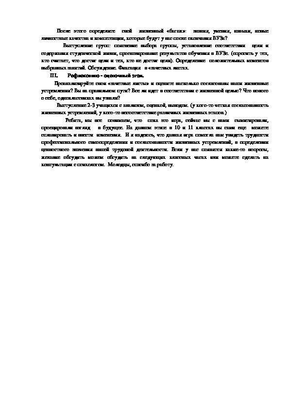 Цель: создать условия для формирования у учащихся способности к целеполаганию и построению жизненных планов во временной перспективе.