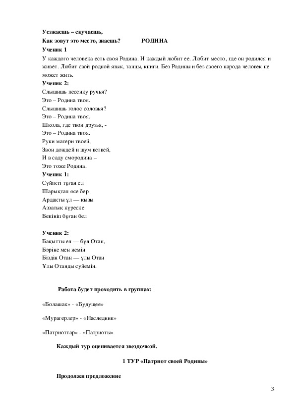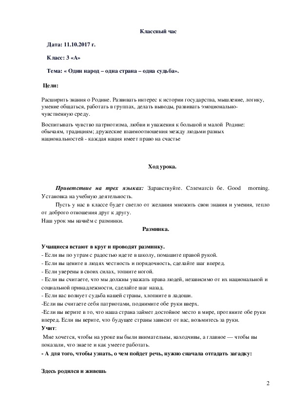Воспитывать чувство патриотизма, любви и уважения к большой и малой Родине: обычаям, традициям; дружеские взаимоотношения между людьми разных национальностей - каждая нация имеет право на счастьеКлассный час "Один народ - одна страна - одна судьба" 3 класс