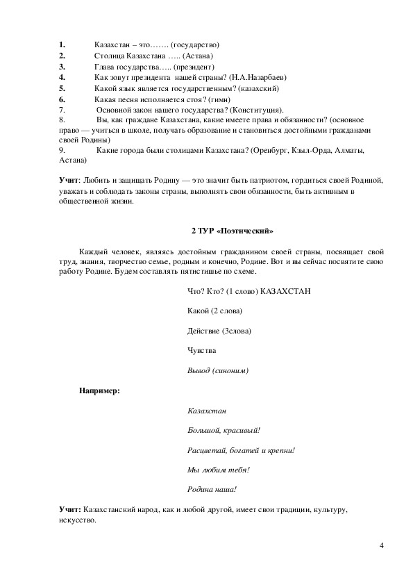 4. Как зовут президента нашей страны? (Н.А.Назарбаев)