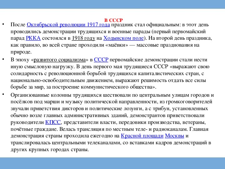 проводились демонстрации трудящихся и военные парады (первый первомайский