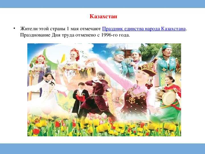 • Жители этой страны 1 мая отмечают Праздник единства народа Казахстана.