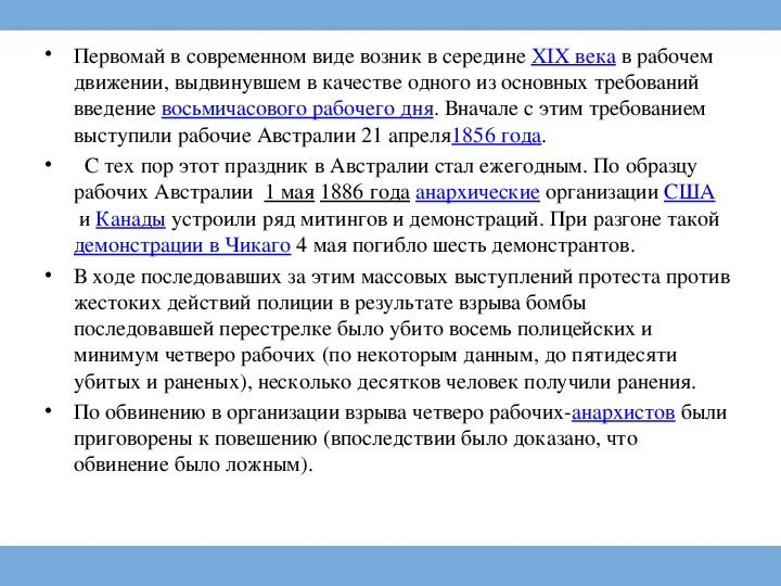 В некоторых странах День труда отмечается в другое время — к ним относятся, например, США, Япония, Австралия и Новая Зеландия. Первомай в современном виде возник в середине XIX века в рабочем движении, выдвинувшем в качестве одного из основных требований введение восьмичасового рабочего дня. Вначале с этим требованием выступили рабочие Австралии 21 апреля1856 года. С тех пор этот праздник в Австралии стал ежегодным. По образцу рабочих Австралии 1 мая 1886.Классный час "Праздник 1 Мая"
