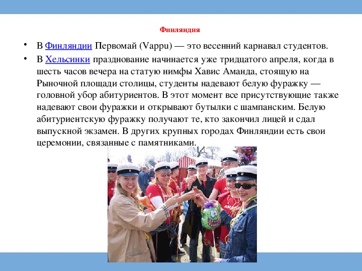 • В Финляндии Первомай (Vappu) — это весенний карнавал студентов.