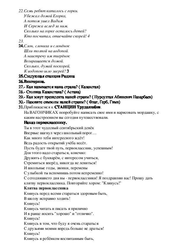 данный сценарий поможет преподавателям провести интересный классный час, он строится как путешествие в страну знаний, дети с интересом отвечают на вопросы , а так же разгадывают загадки, решают задачи, отгадывают сказочных героев, так же выполняют на вагончиках в конце урока пишут свои имена с удовольствием