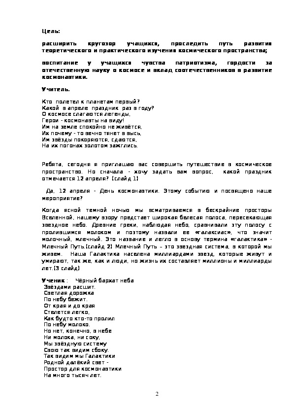 воспитание у учащихся чувства патриотизма, гордости за отечественную науку о космосе и вклад соотечественников в развитие космонавтики.