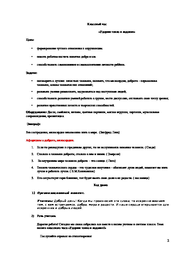 • поговорить о лучших качествах человека, показать, что милосердие, доброта – первооснова человека, основа человеческих отношений;