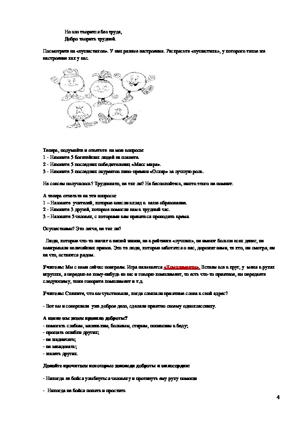 Учитель: Мы с вами сейчас поиграем. Игра называется «Комплименты». Встаем все в круг, у меня в руках