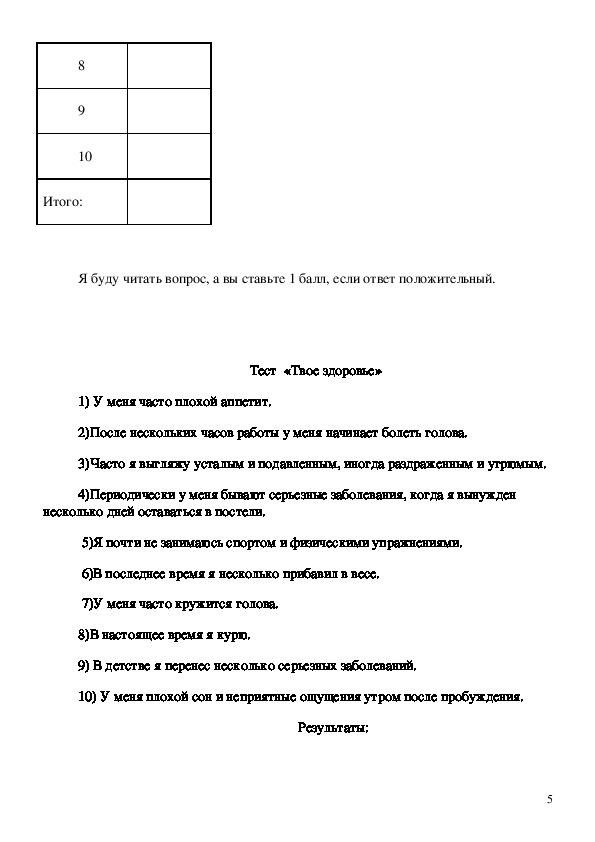 Я буду читать вопрос, а вы ставьте 1 балл, если ответ положительный.