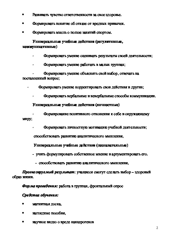 Прогнозируемый результат: учащиеся смогут сделать выбор – здоровый