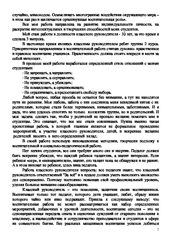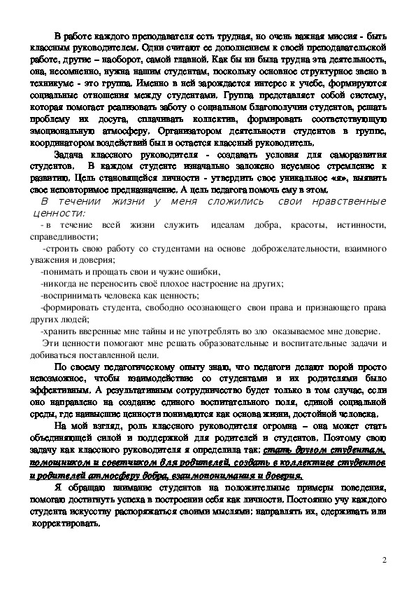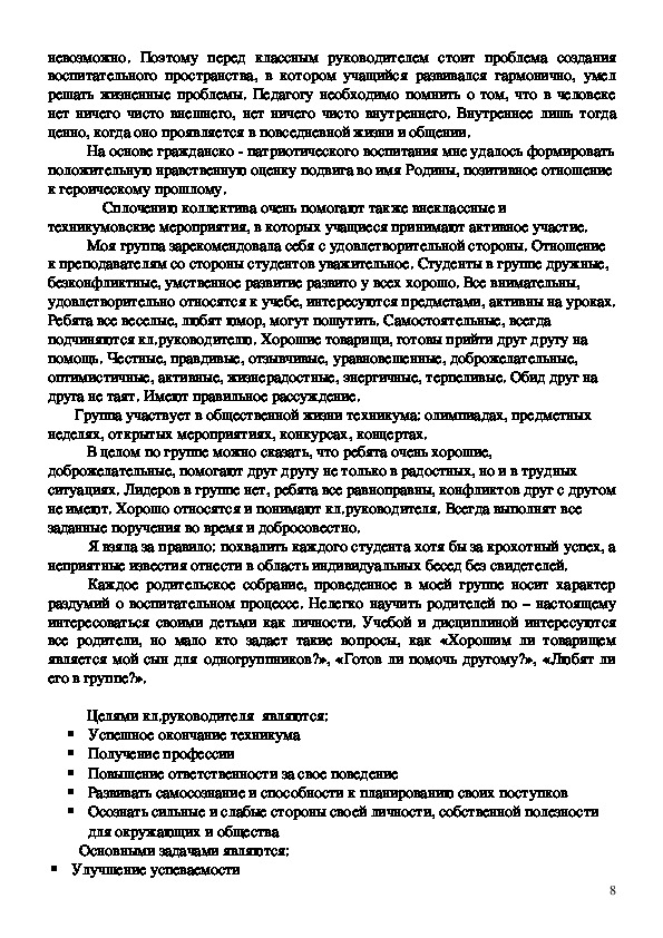 В работе каждого преподавателя есть трудная, но очень важная миссия - быть классным руководителем. Одни считают ее дополнением к своей преподавательской работе, другие – наоборот, самой главной. Как бы ни была трудна эта деятельность, она, несомненно, нужна нашим студентам, поскольку основное структурное звено в техникуме - это группа. Именно в ней зарождается интерес к учебе, формируются социальные отношения между студентами. Группа представляет собой систему, которая помогает реализовать заботу о социальном благополучии студентов, решать проблему их досуга, сплачивать коллектив, формировать соответствующую эмоциональную атмосферу. Организатором деятельности студентов в группе, координатором воздействий был и остается классный руководитель.