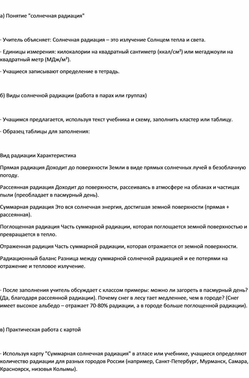 · После заполнения учитель обсуждает с классом примеры: можно ли загореть в пасмурный день? (Да, благодаря рассеянной радиации). Почему снег в лесу тает медленнее, чем в городе? (Снег имеет высокое альбедо – отражает 70-80% радиации, а в городе больше поглощенной радиации).