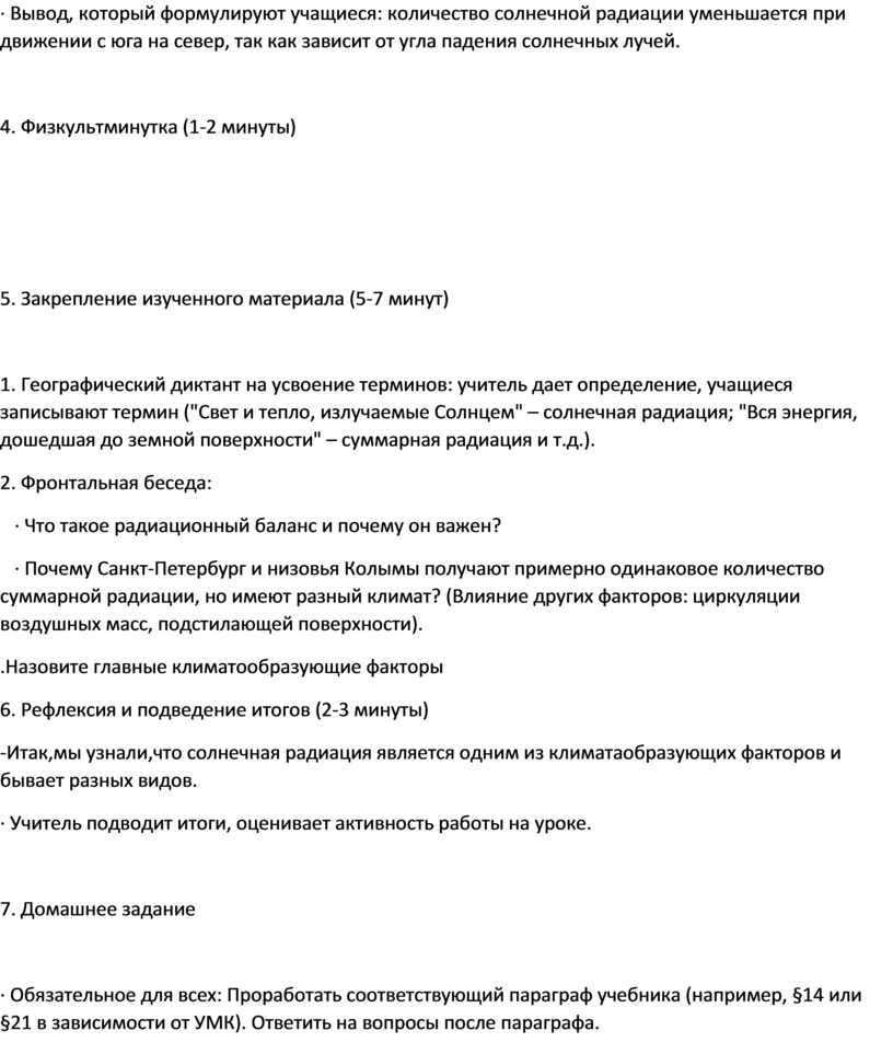 1. Географический диктант на усвоение терминов: учитель дает определение, учащиеся записывают термин ("Свет и тепло, излучаемые Солнцем" – солнечная радиация; "Вся энергия, дошедшая до земной поверхности" – суммарная радиация и т.д.).