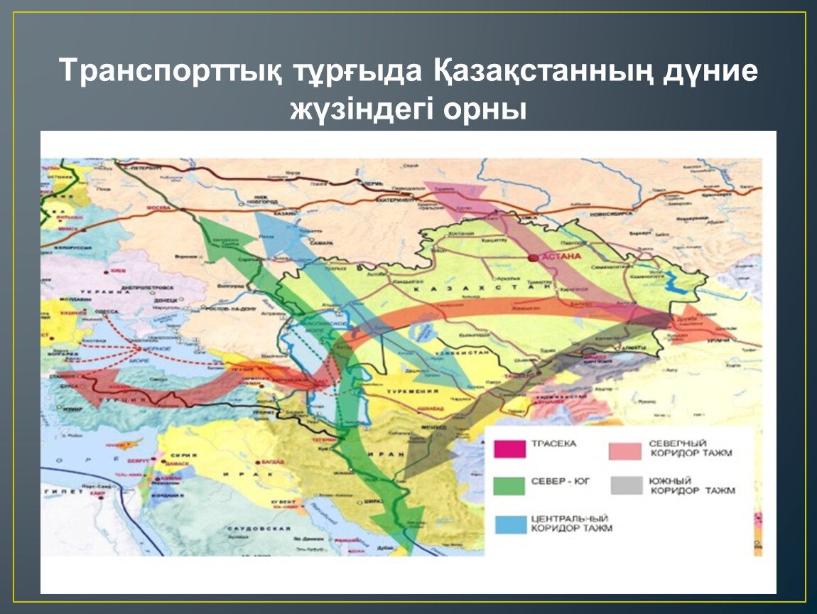 Темір жол көлігі – республиканың көлік кешеніндегі маңызды қатынас құралы, көлік инфрақұрылымындағы басты буын. Қазақстанның географиялық жағдайы (теңізге тікелей шығу мүмкіндігінің жоқтығы), оның ұлан-байтақ аумақты алып жатуы, өндірістің шикізаттық құрылымы, өндіргіш күштердің орналасуы, автожол инфрақұрылымының жеткілікті дамымағандығы себепті темір жол көлігінің ел экономикасындағы рөлі айрықша маңызды. Тасымалданатын негізгі өнімдер – көмір, астық, мұнай, кентас, минералдық тыңайтқыш сияқты автомобиль көлігімен тасымалдауға тиімсіз сусымалы және сұйық жүктер.Автомобиль көлігі – жүктерді таяу және орта қашықтыққа жедел жеткізетін тиімді көлік құралы. Ол Қазақстанда кезең-кезеңмен дамыды. Қазақстандағы халықаралық автомобиль тасымалы, негізінен, халықаралық маңызы бар автомобиль жолдарында орындалады. Олар 7 дәлізге бөлінеді.