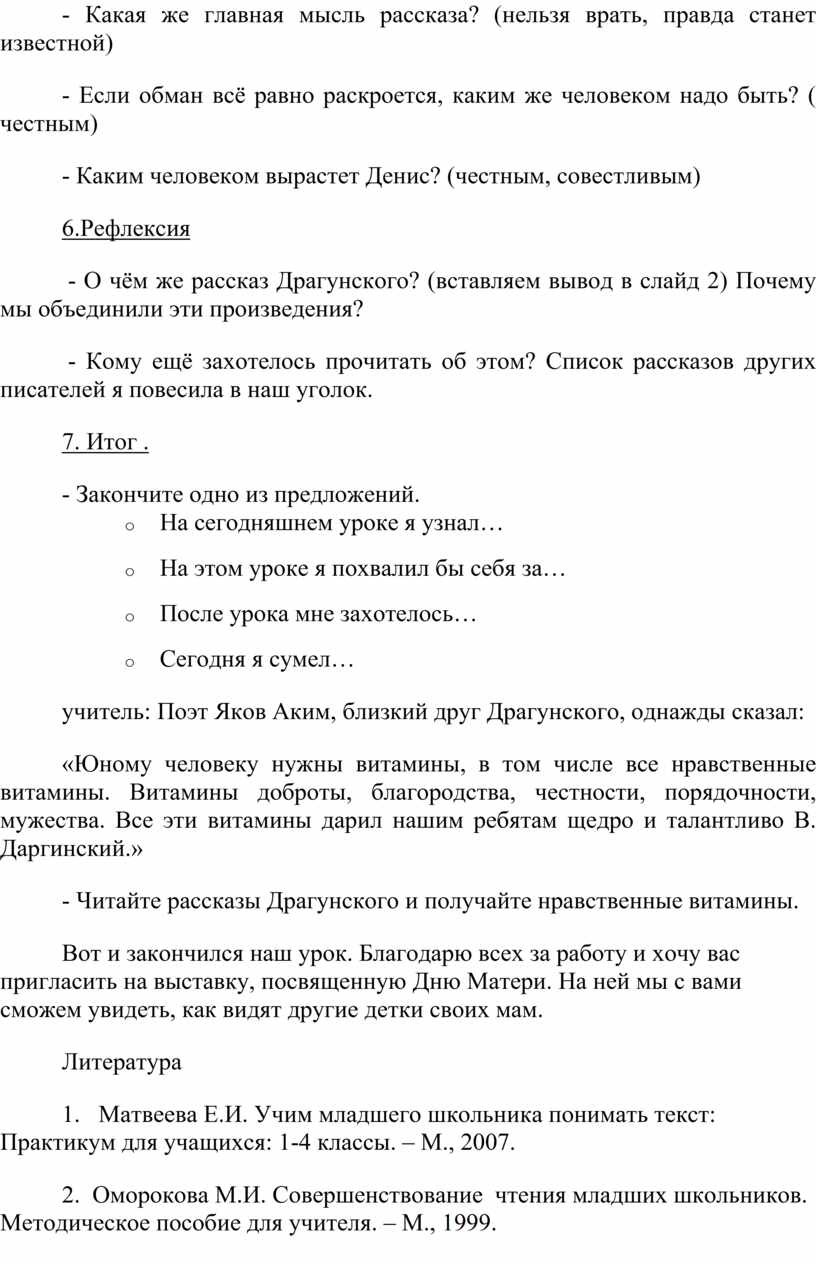 1. Матвеева Е.И. Учим младшего школьника понимать текст: Практикум для учащихся: 1-4 классы. – М., 2007.
