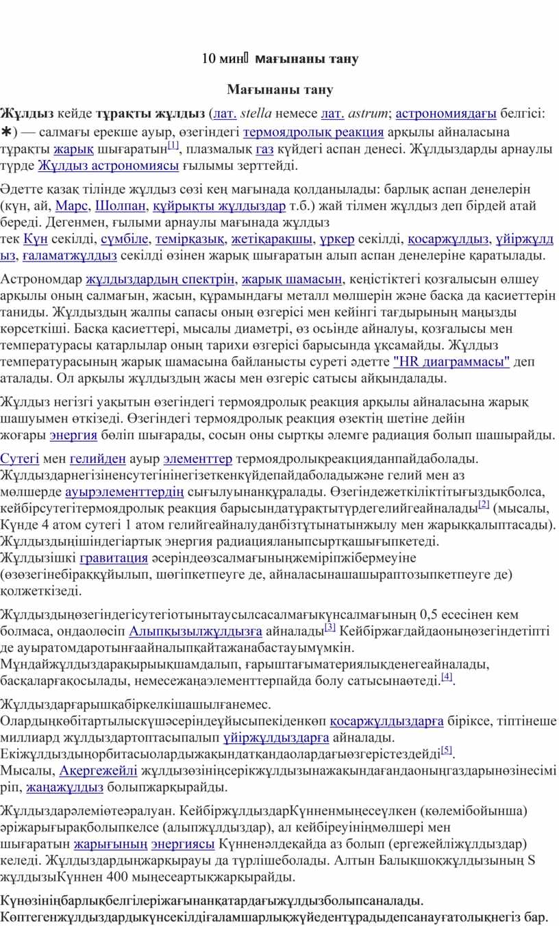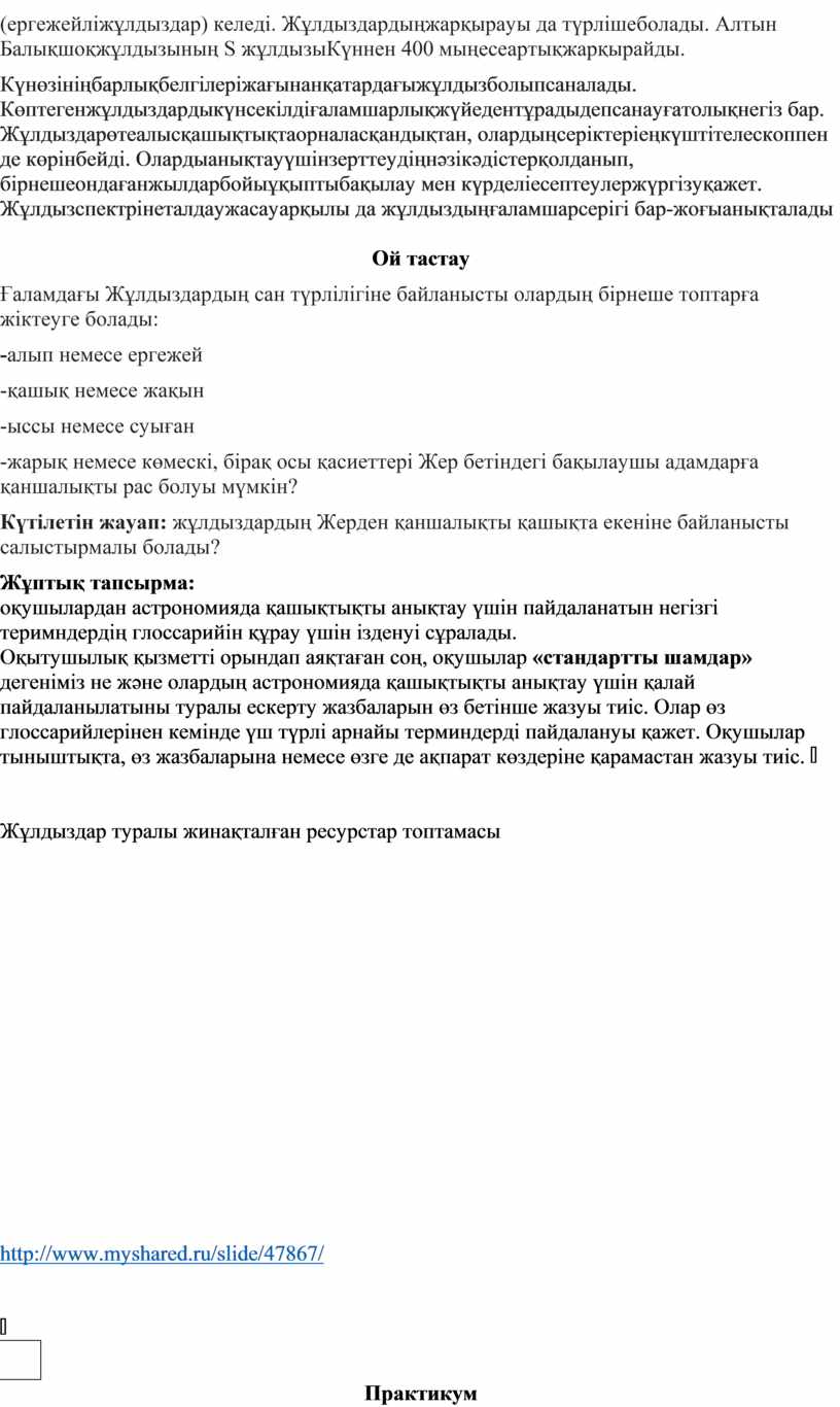 Оқушылардан күтілетін ақпараттар: жұлдыздар көлемі, массасы, жарықтылығы мен Жерден қашықтығы туралы өздерінің біілетін ақпараттарын көрсетеді.