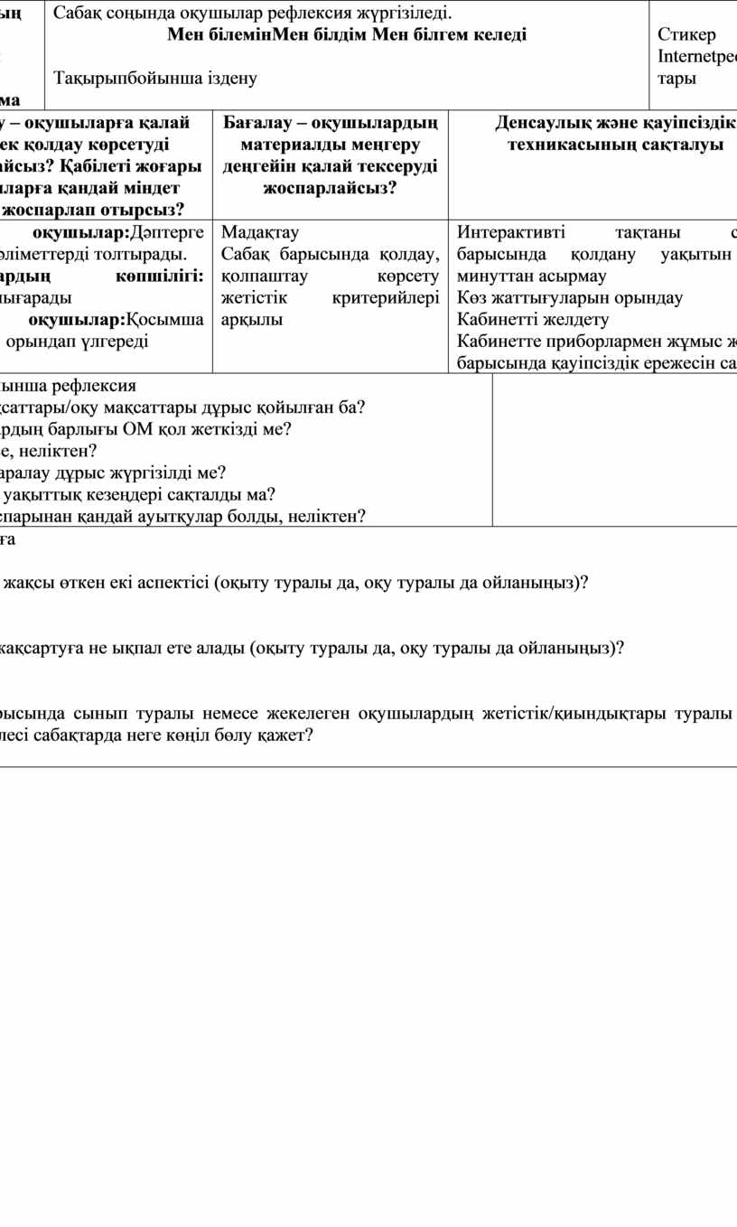 Сабақ бойынша рефлексия Сабақ мақсаттары/оқу мақсаттары дұрыс қойылған ба? Оқушылардың барлығы ОМ қол жеткізді ме? Жеткізбесе, неліктен? Сабақта саралау дұрыс жүргізілді ме? Сабақтың уақыттық кезеңдері сақталды ма? Сабақ жоспарынан қандай ауытқулар болды, неліктен? |