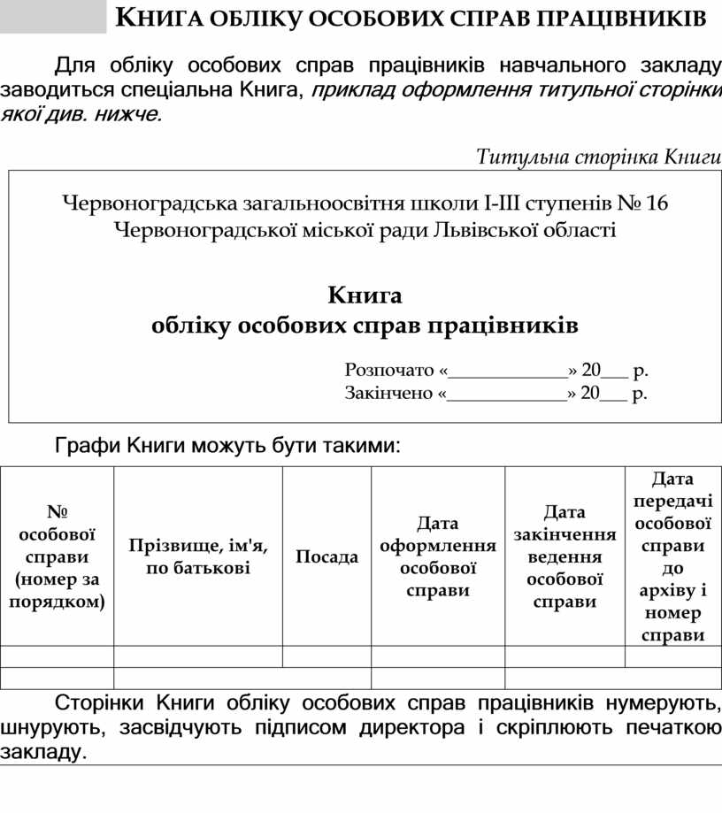 Для обліку особових справ працівників навчального закладу заводиться спеціальна Книга, приклад оформлення титульної сторінки якої див. нижче.