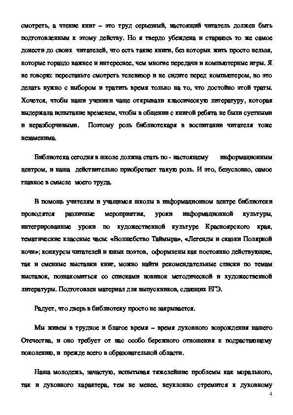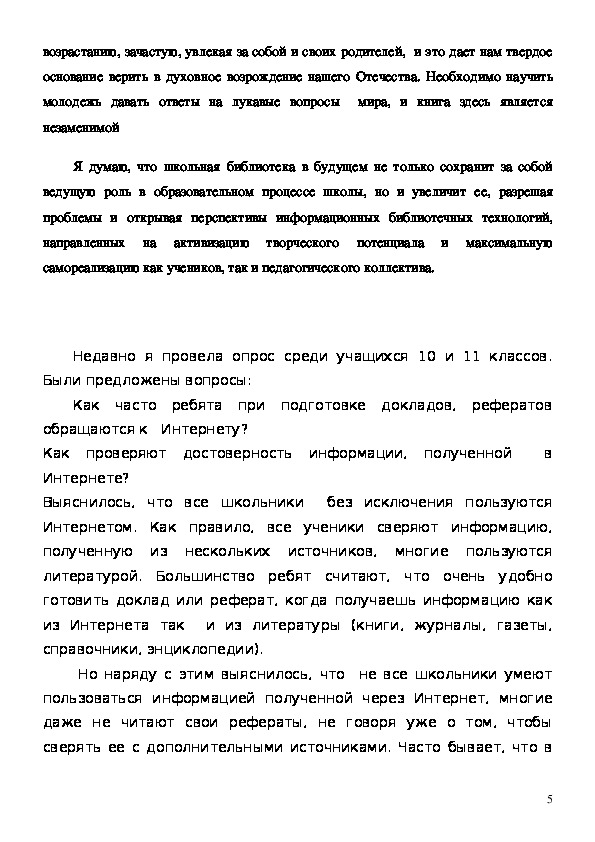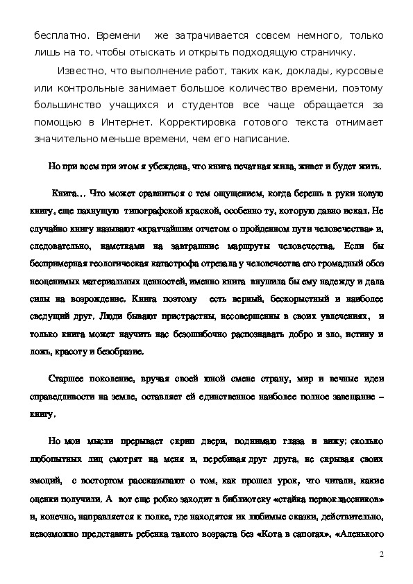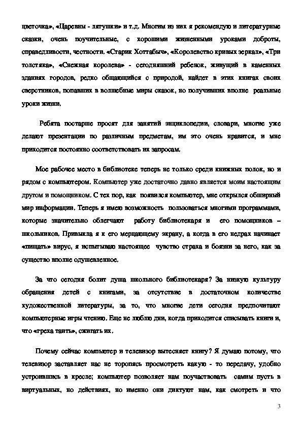 Данная работа содержит рассуждение автора об обоснованности выбора профессии, о современной библиотеке, которая должна стать информационным центром образовательного учреждения, позволяющим получить практически любую информацию, электронные учебники.