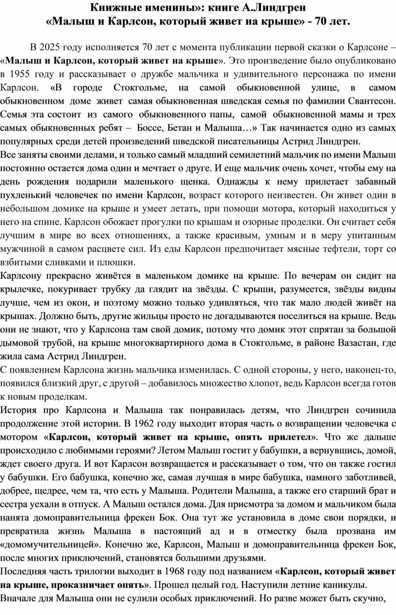 В 2025 году исполняется 70 лет с момента публикации первой сказки о Карлсоне – «Малыш и Карлсон, который живет на крыше». Это произведение было опубликовано в 1955 году и рассказывает о дружбе мальчика и удивительного персонажа по имени Карлсон. «В городе Стокгольме, на самой обыкновенной улице, в самом обыкновенном доме живет самая обыкновенная шведская семья по фамилии Свантесон. Семья эта состоит из самого обыкновенного папы, самой обыкновенной мамы и трех самых обыкновенных ребят – Боссе, Бетан и Малыша…» Так начинается одно из самых популярных среди детей произведений шведской писательницы Астрид Линдгрен.