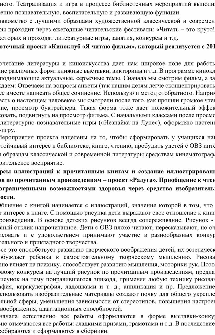 -Конкурсы иллюстраций к прочитанным книгам и создание иллюстрированных сборников по прочитанным произведениям – проект «Радуга». Приобщение к чтению детей с ограниченными возможностями здоровья через средства изобразительной деятельности.