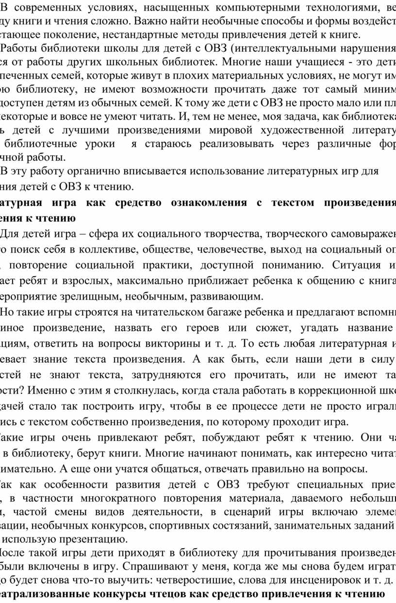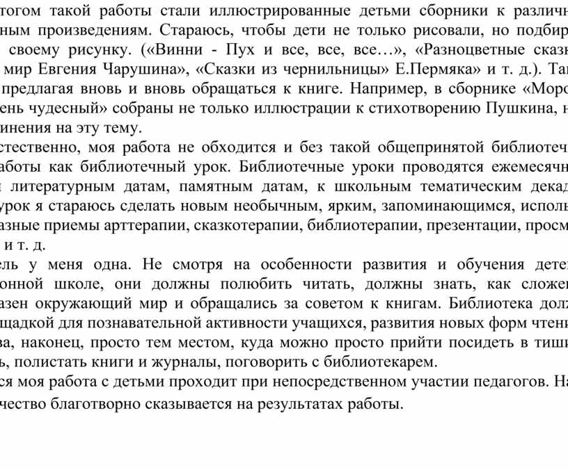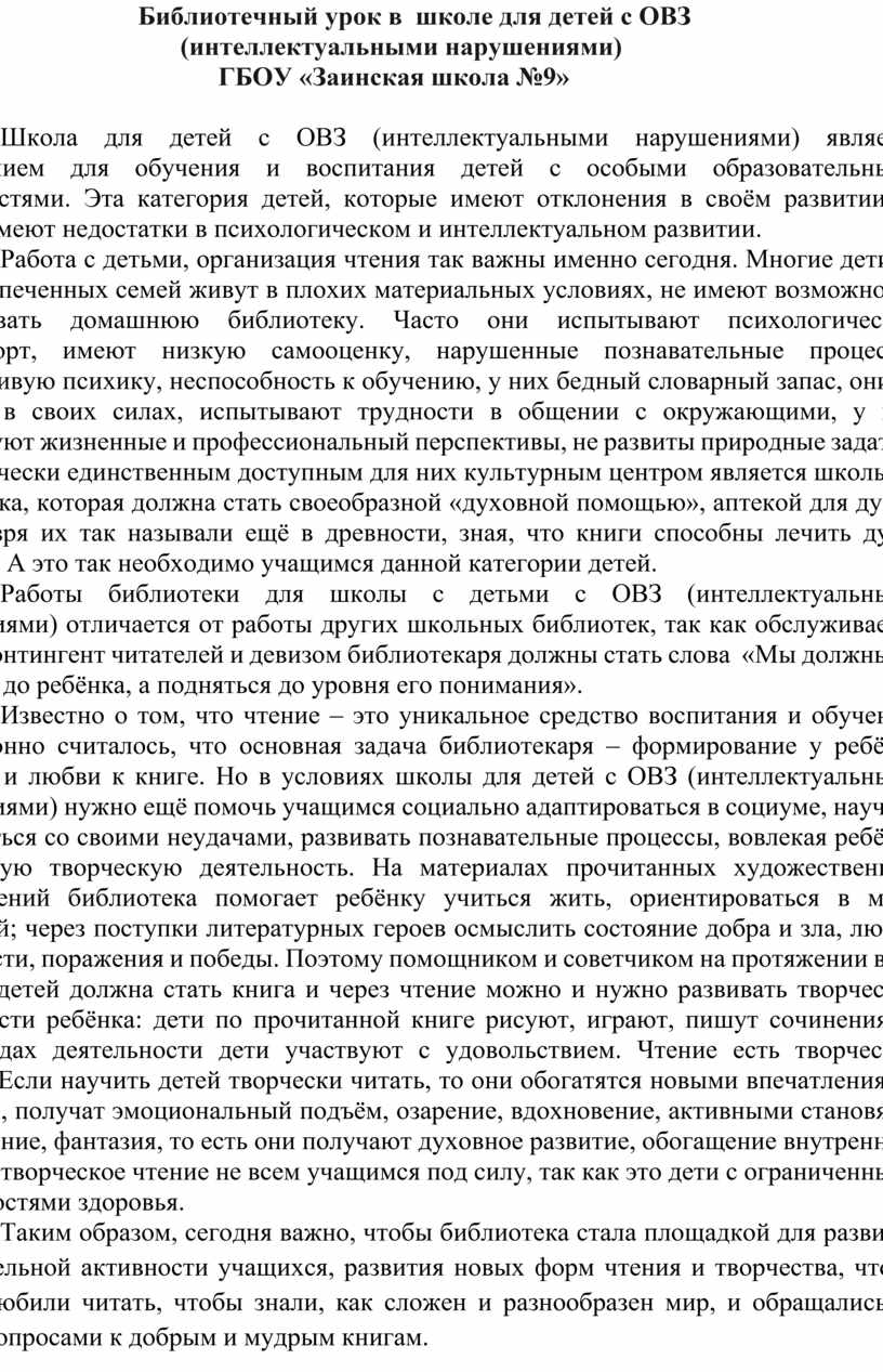 Работы библиотеки школы для детей с ОВЗ (интеллектуальными нарушениями) отличается от работы других школьных библиотек. Многие наши учащиеся - это дети из малообеспеченных семей, которые живут в плохих материальных условиях, не могут иметь домашнюю библиотеку, не имеют возможности прочитать даже тот самый минимум, который доступен детям из обычных семей. К тому же дети с ОВЗ не просто мало или плохо читают, некоторые и вовсе не умеют читать. И, тем не менее, моя задача, как библиотекаря, знакомить детей с лучшими произведениями мировой художественной литературы. Поэтому библиотечные уроки я стараюсь реализовывать через различные формы библиотечной работы.