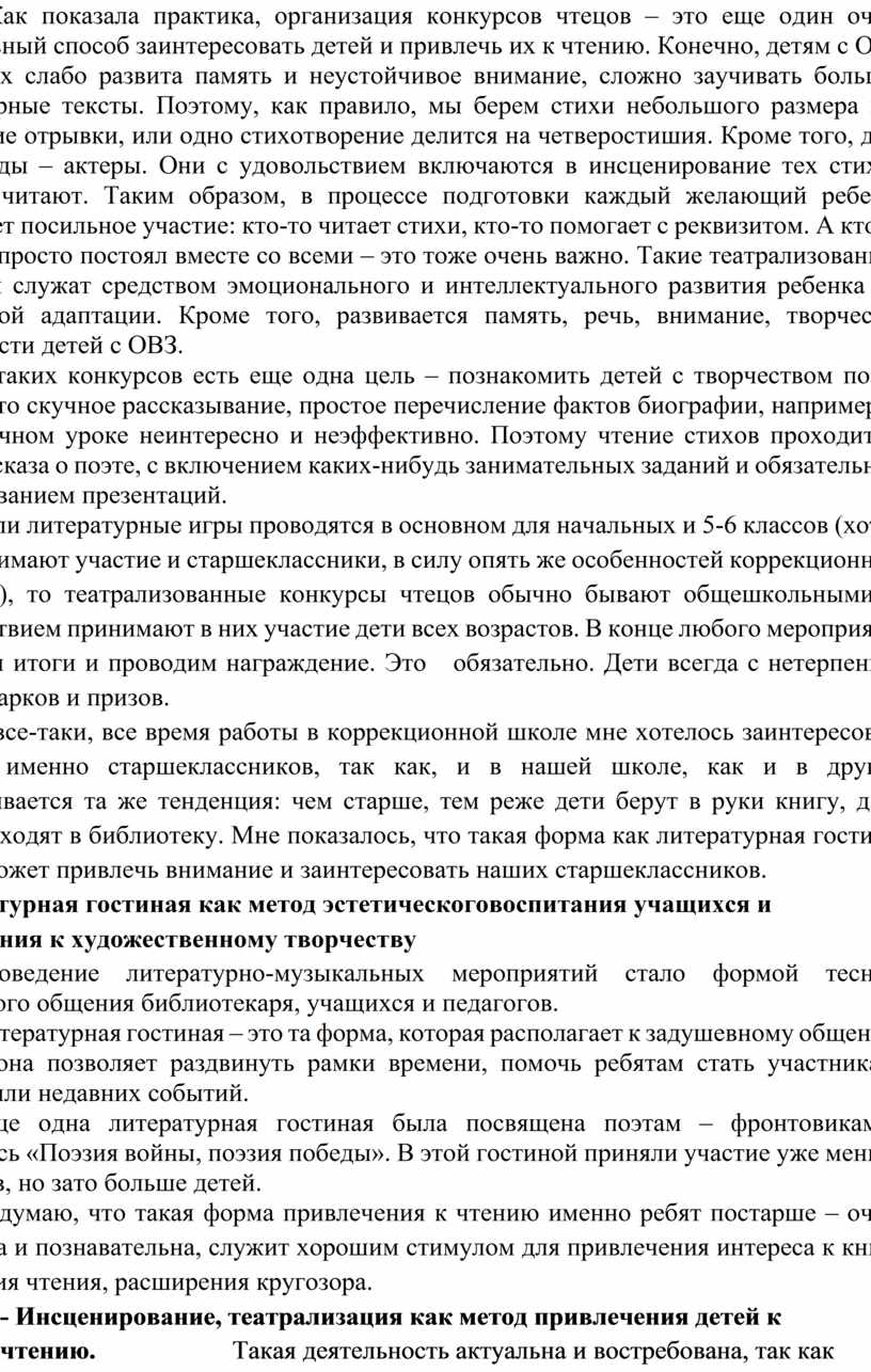 Как показала практика, организация конкурсов чтецов – это еще один очень эффективный способ заинтересовать детей и привлечь их к чтению. Конечно, детям с ОВЗ, у которых слабо развита память и неустойчивое внимание, сложно заучивать большие стихотворные тексты. Поэтому, как правило, мы берем стихи небольшого размера или небольшие отрывки, или одно стихотворение делится на четверостишия. Кроме того, дети от природы – актеры. Они с удовольствием включаются в инсценирование тех стихов, которые читают. Таким образом, в процессе подготовки каждый желающий ребенок принимает посильное участие: кто-то читает стихи, кто-то помогает с реквизитом. А кто-то вышел и просто постоял вместе со всеми – это тоже очень важно. Такие театрализованные конкурсы служат средством эмоционального и интеллектуального развития ребенка его социальной адаптации. Кроме того, развивается память, речь, внимание, творческие способности детей с ОВЗ.