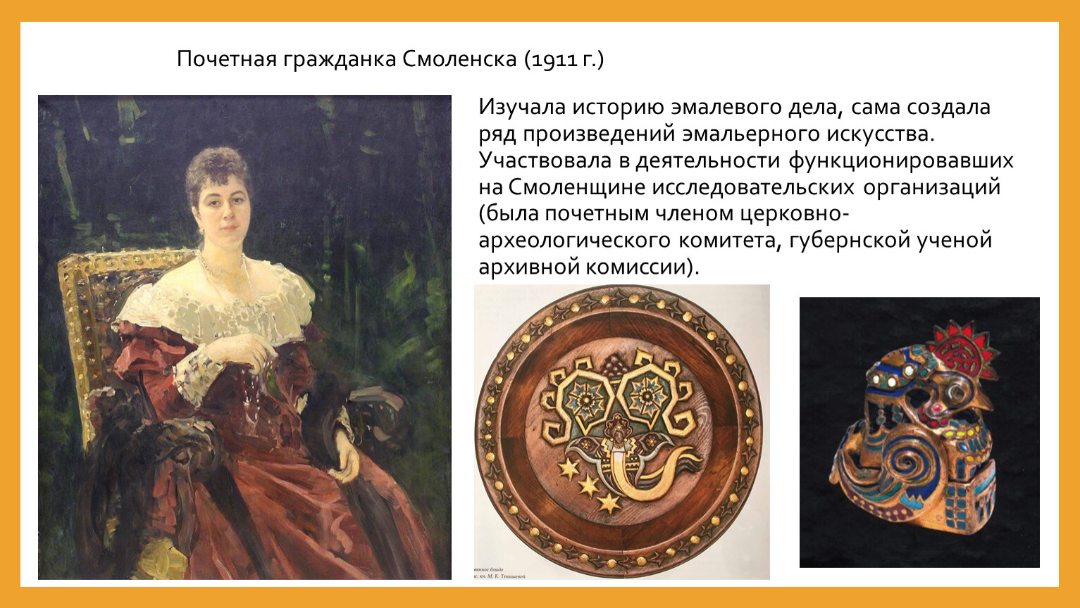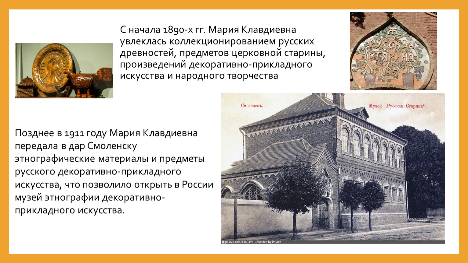 Позднее в 1911 году Мария Клавдиевна передала в дар Смоленску этнографические материалы и предметы русского декоративно-прикладного искусства, что позволило открыть в России музей этнографии декоративно-прикладного искусства.