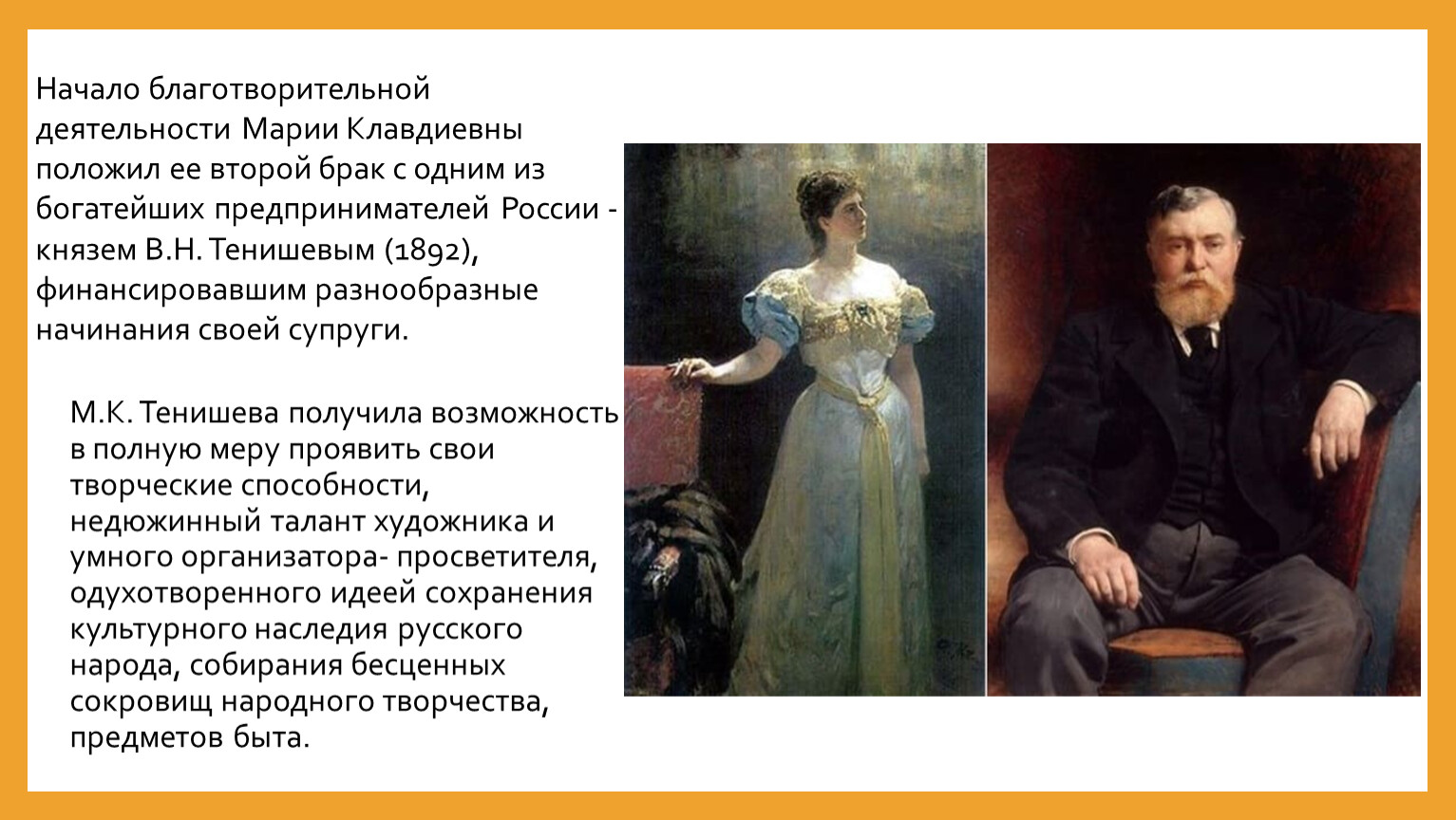 Начало благотворительной деятельности Марии Клавдиевны положил ее второй брак с одним из богатейших предпринимателей России - князем В.Н. Тенишевым (1892), финансировавшим разнообразные начинания своей супруги.