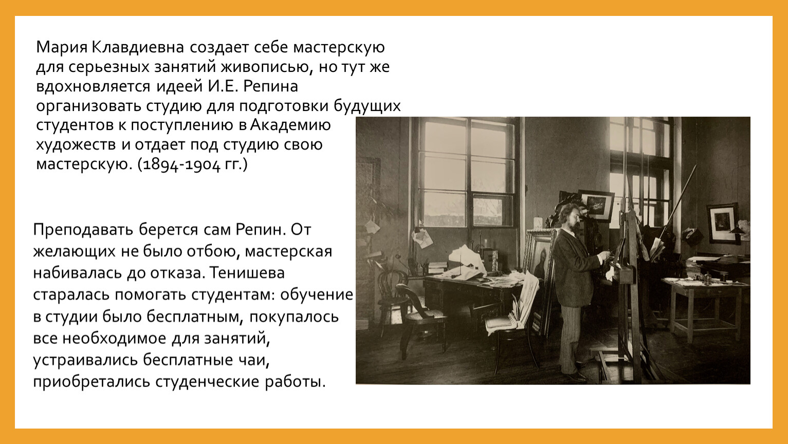 Мария Клавдиевна создает себе мастерскую для серьезных занятий живописью, но тут же вдохновляется идеей И.Е. Репина организовать студию для подготовки будущих студентов к поступлению в Академию художеств и отдает под студию свою мастерскую. (1894-1904 гг.)