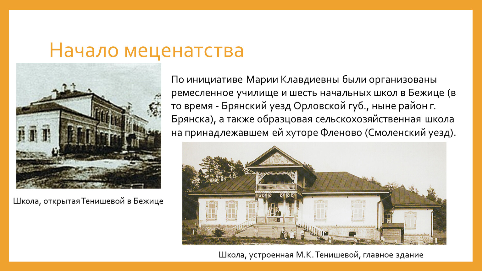 В Смоленске М.К. Тенишева открыла рисовальную школу в 1896 г., которая явилась своего рода филиалом ее Петербургской рисовальной студии, руководимой И.Е. Репиным.