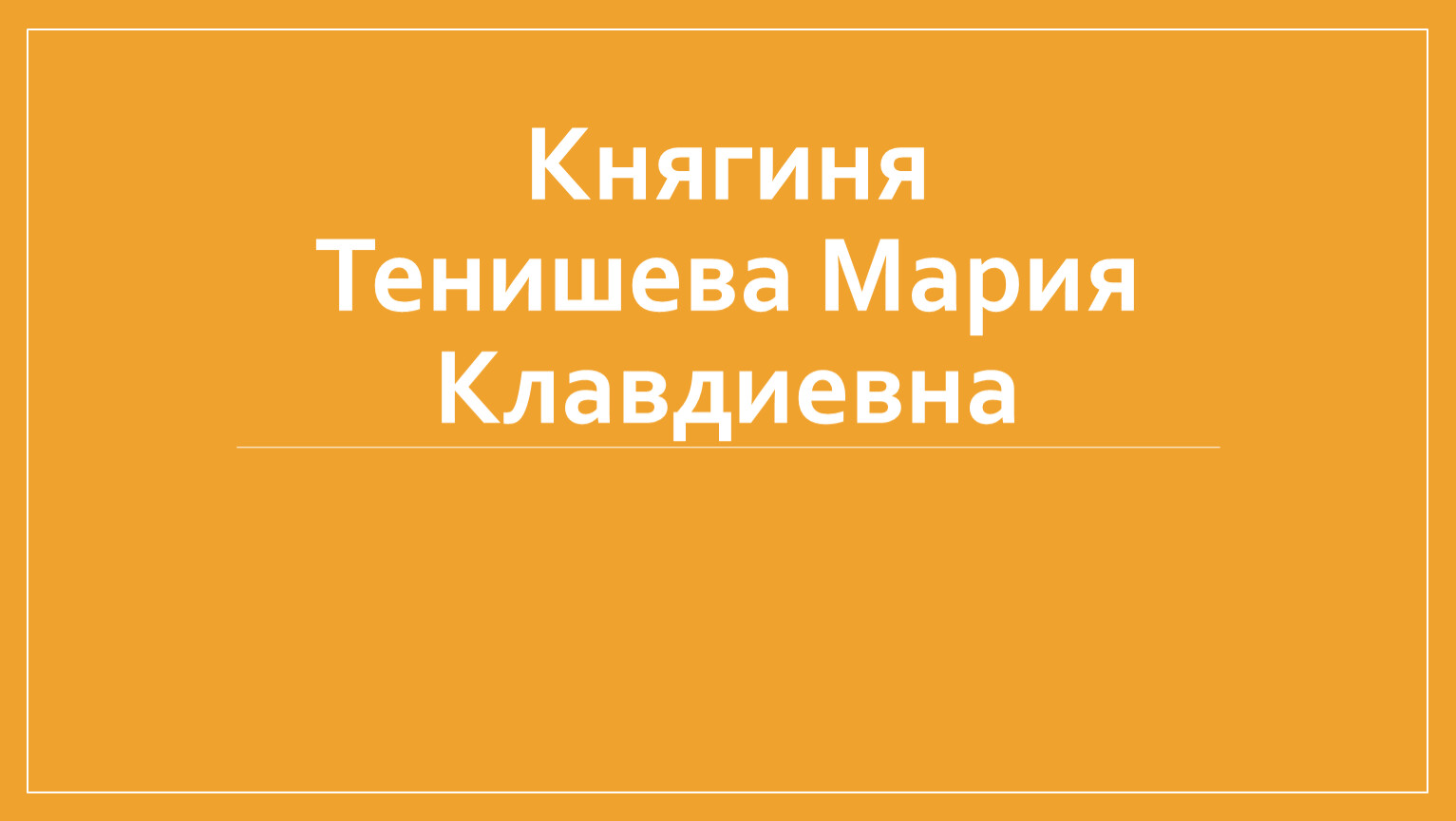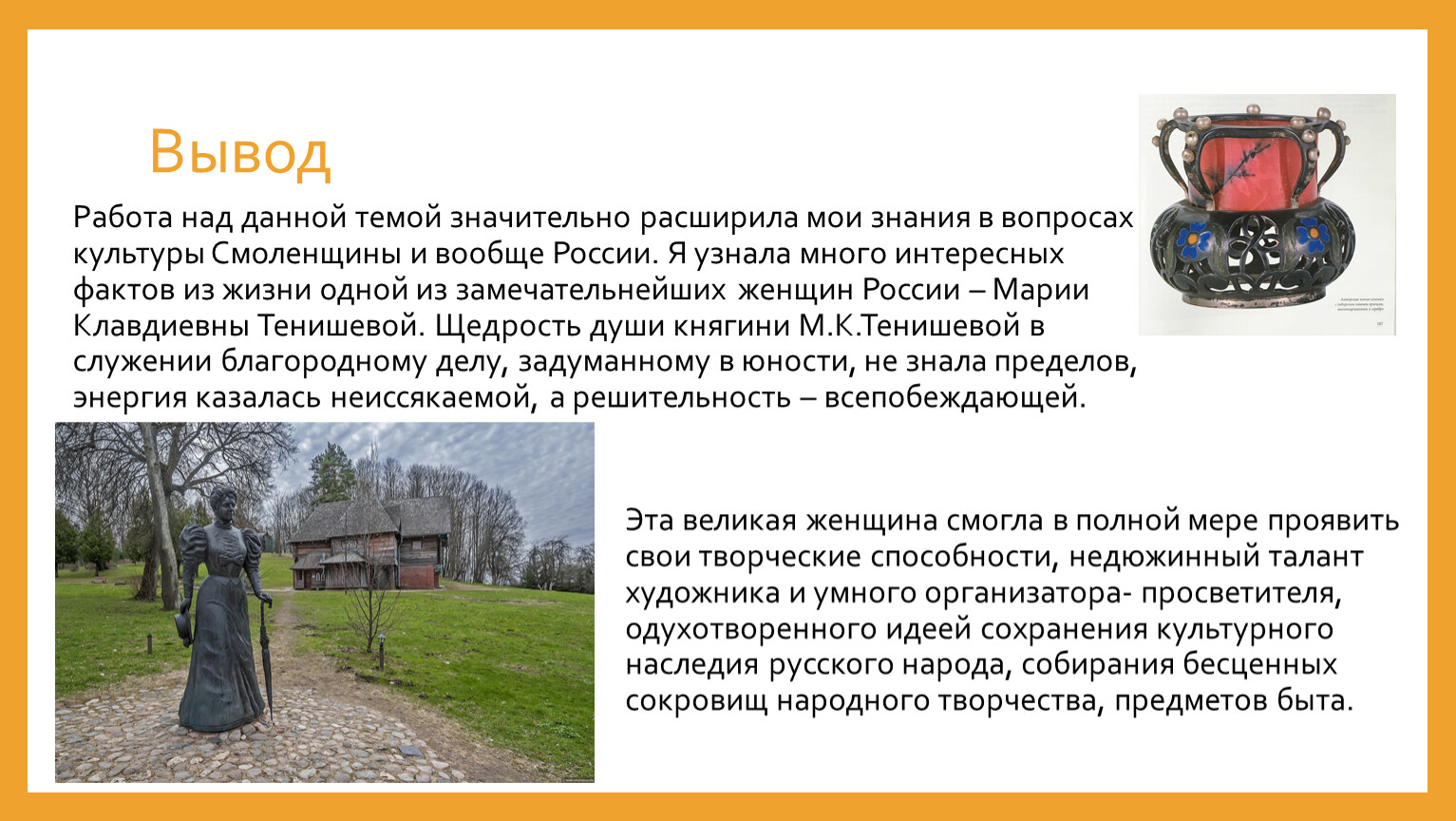Работа над данной темой значительно расширила мои знания в вопросах культуры Смоленщины и вообще России. Я узнала много интересных фактов из жизни одной из замечательнейших женщин России – Марии Клавдиевны Тенишевой. Щедрость души княгини М.К.Тенишевой в служении благородному делу, задуманному в юности, не знала пределов, энергия казалась неиссякаемой, а решительность – всепобеждающей.