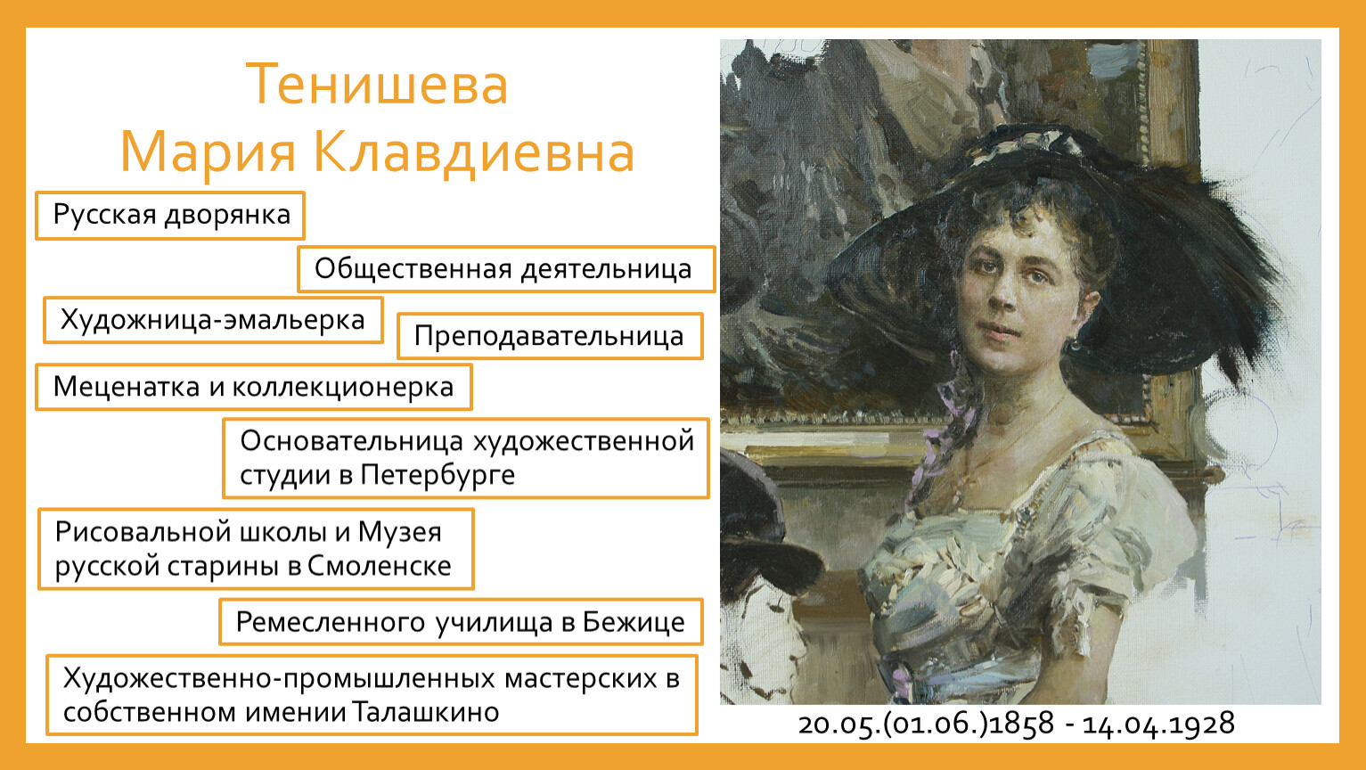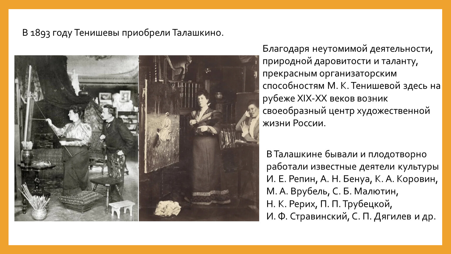 Благодаря неутомимой деятельности, природной даровитости и таланту, прекрасным организаторским способностям М. К. Тенишевой здесь на рубеже XIX-XX веков возник своеобразный центр художественной жизни России.