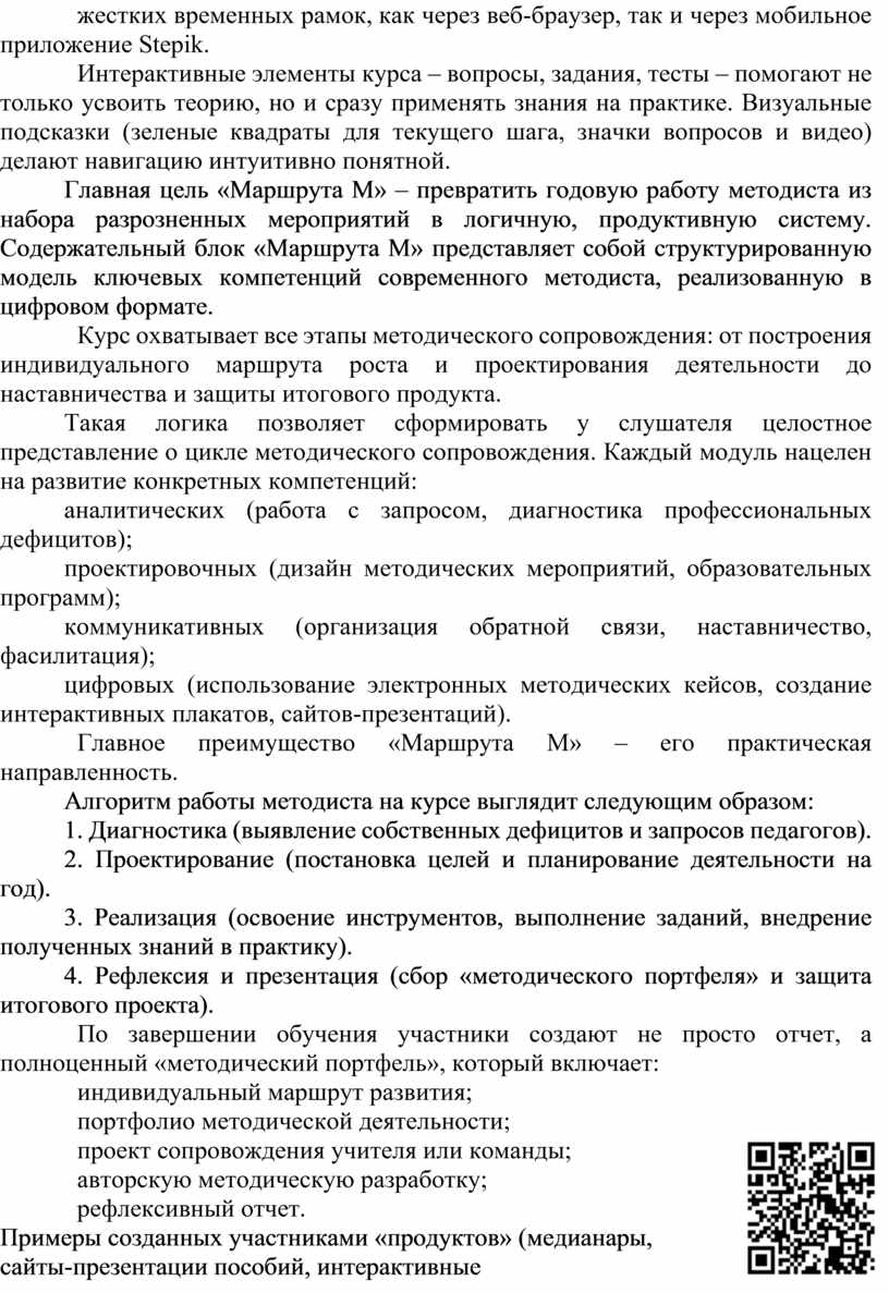 «Маршрут М» – это не просто набор лекций, а полноценный годовой образовательный маршрут; это онлайн-курс, размещенный на образовательной платформе Stepik, что делает его доступным и удобным для всех. Он призван стать надежным навигатором для методистов, особенно для тех, кто только начинает свой профессиональный путь или стремится выйти за рамки административного сопровождения и стать настоящим наставником, проектировщиком образовательной среды.