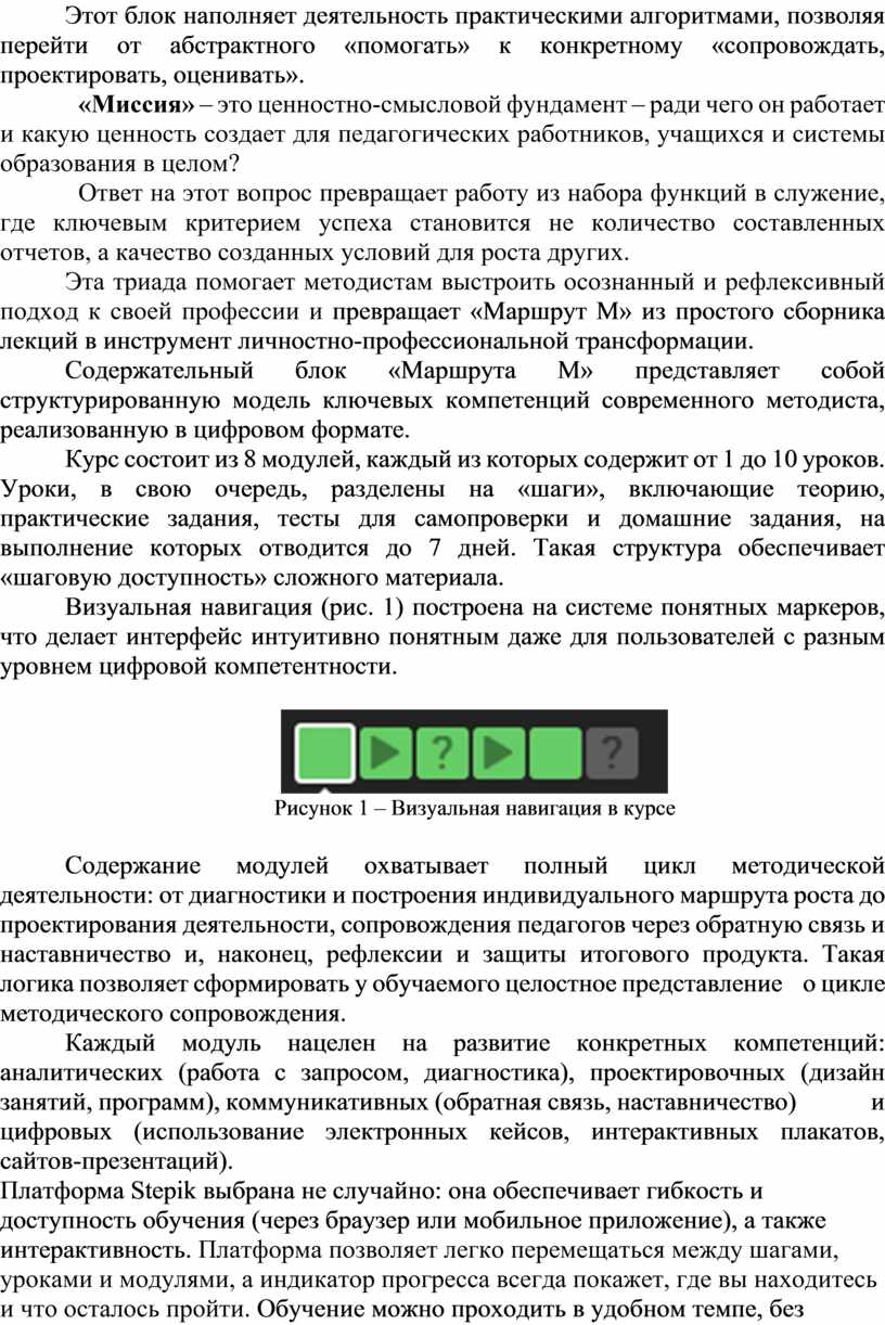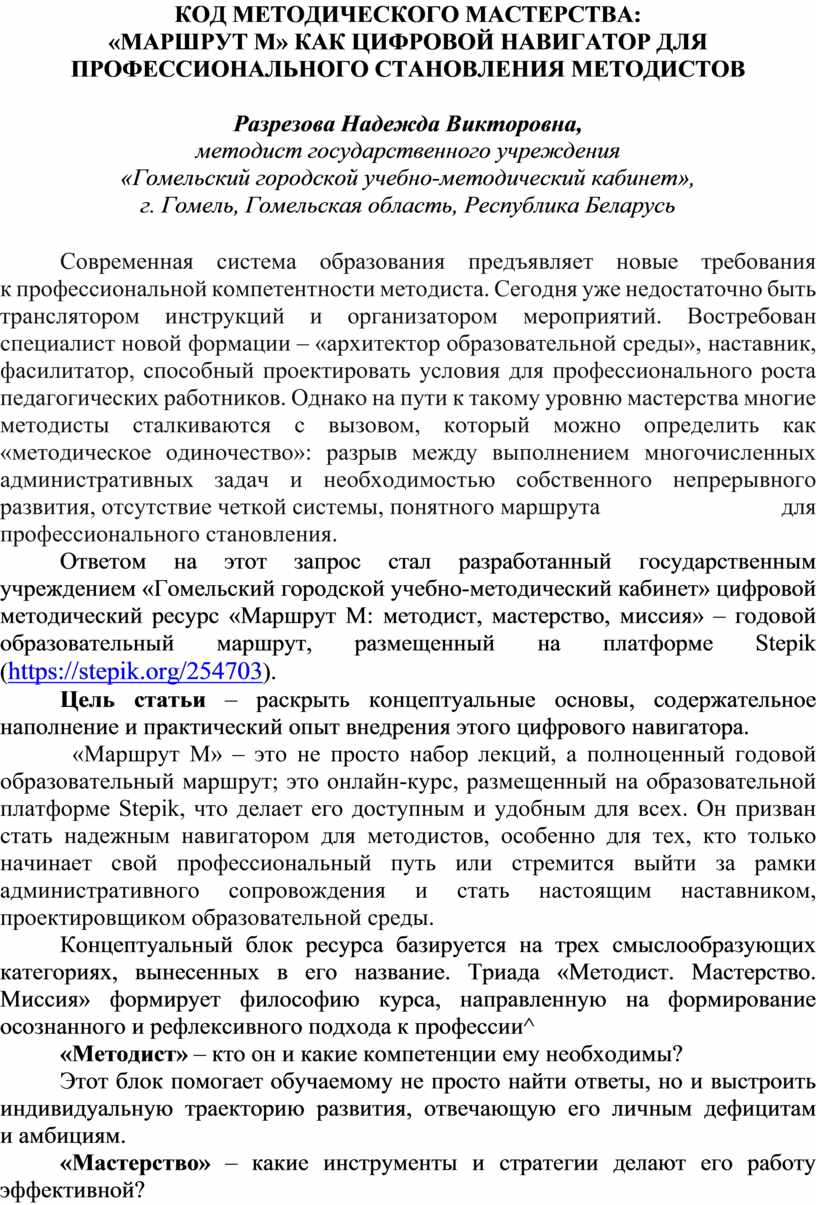 Ответом на этот запрос стал разработанный государственным учреждением «Гомельский городской учебно-методический кабинет» цифровой методический ресурс «Маршрут М: методист, мастерство, миссия» – годовой образовательный маршрут, размещенный на платформе Stepik (https://stepik.org/254703).