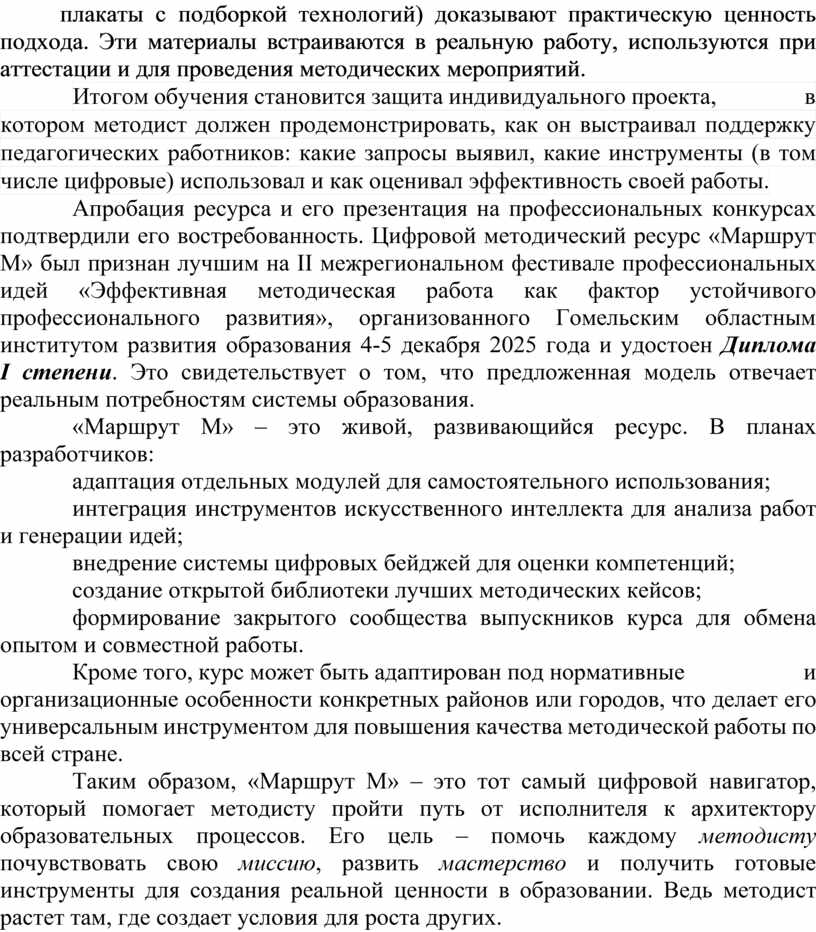 Апробация ресурса и его презентация на профессиональных конкурсах подтвердили его востребованность. Цифровой методический ресурс «Маршрут М» был признан лучшим на II межрегиональном фестивале профессиональных идей «Эффективная методическая работа как фактор устойчивого профессионального развития», организованного Гомельским областным институтом развития образования 4-5 декабря 2025 года и удостоен Диплома I степени. Это свидетельствует о том, что предложенная модель отвечает реальным потребностям системы образования.