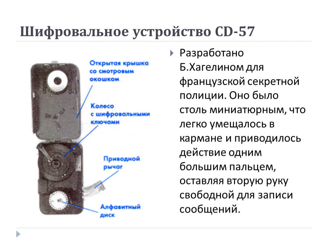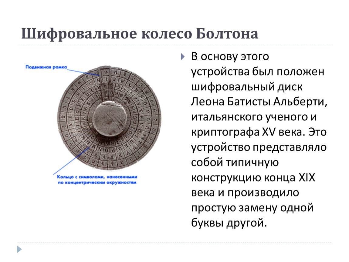 В основу этого устройства был положен шифровальный диск Леона Батисты Альберти, итальянского ученого и криптографа XV века. Это устройство представляло собой типичную конструкцию конца XIX века и производило простую замену одной буквы другой.