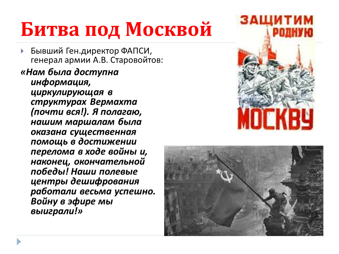 «Нам была доступна информация, циркулирующая в структурах Вермахта (почти вся!). Я полагаю, нашим маршалам была оказана существенная помощь в достижении перелома в ходе войны и, наконец, окончательной победы! Наши полевые центры дешифрования работали весьма успешно. Войну в эфире мы выиграли!»