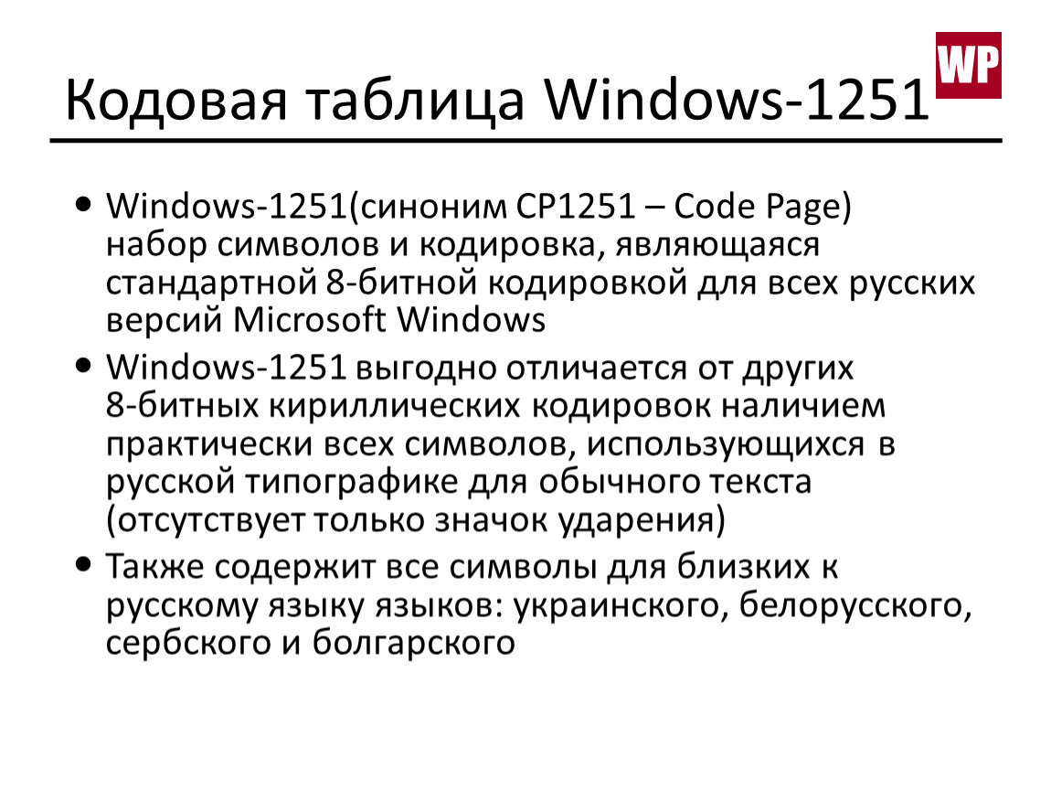 Windows-1251 выгодно отличается от других 8‑битных кириллических кодировок наличием практически всех символов, использующихся в русской типографике для обычного текста (отсутствует только значок ударения)