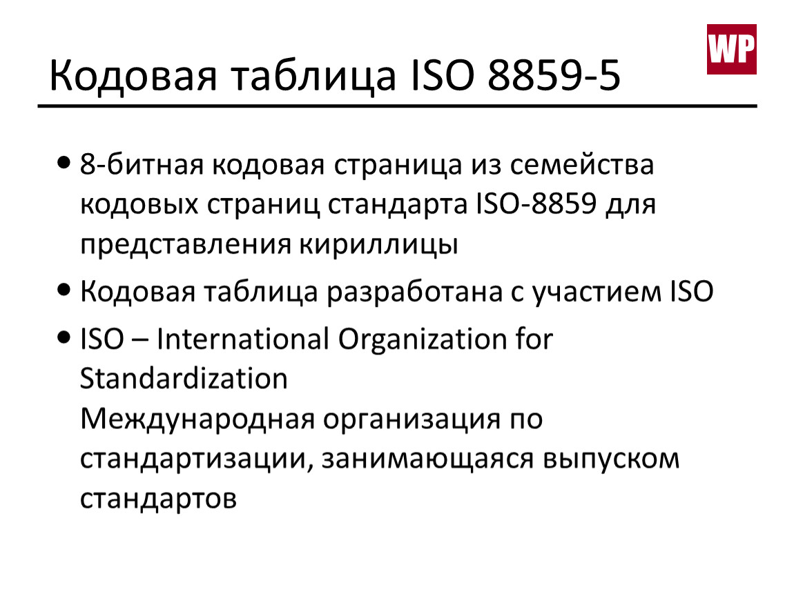 Результат – система 8-битной кодировки Latin1(не включает символов кириллицы)