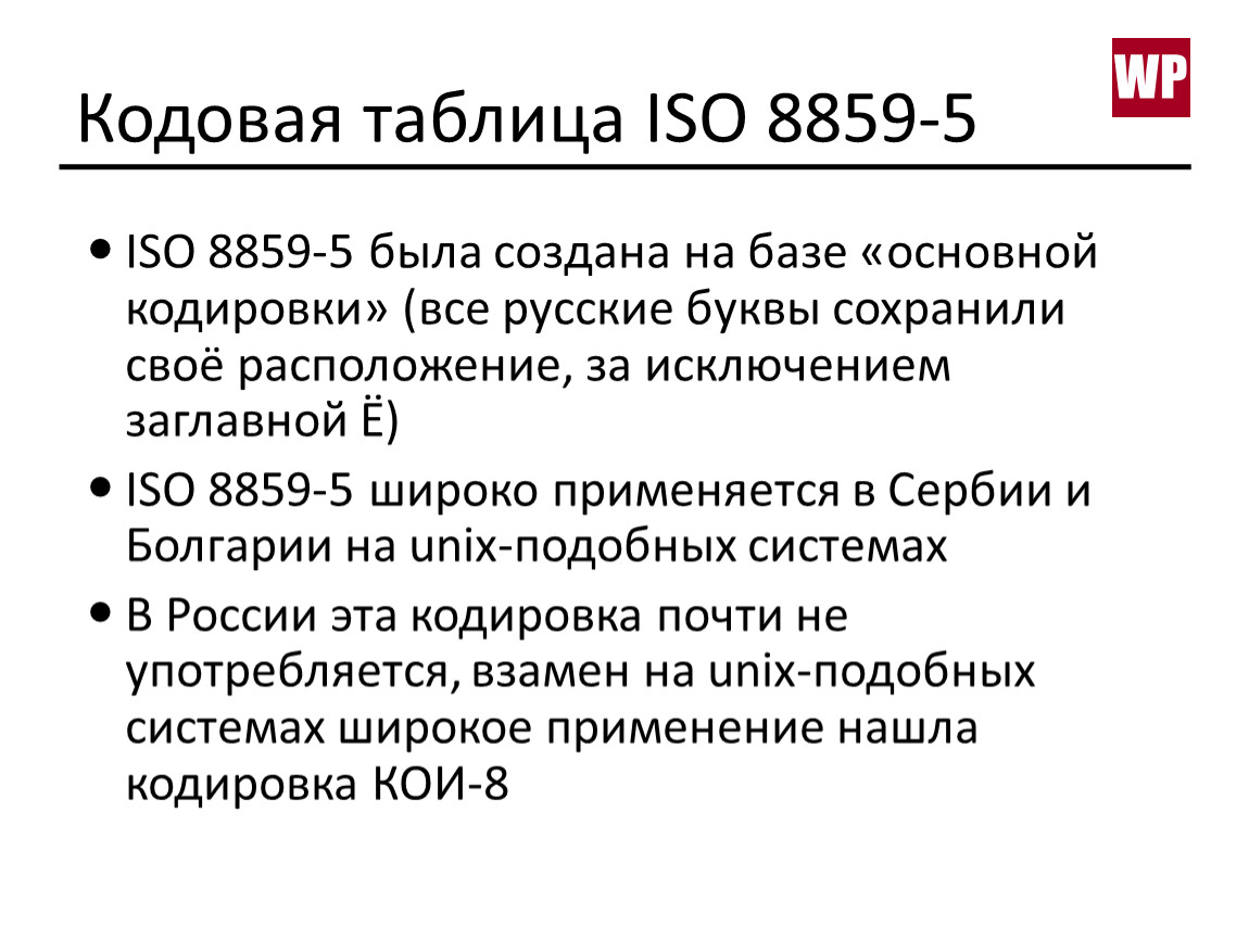 ISO 8859-5 была создана на базе «основной кодировки» (все русские буквы сохранили своё расположение, за исключением заглавной Ё)
