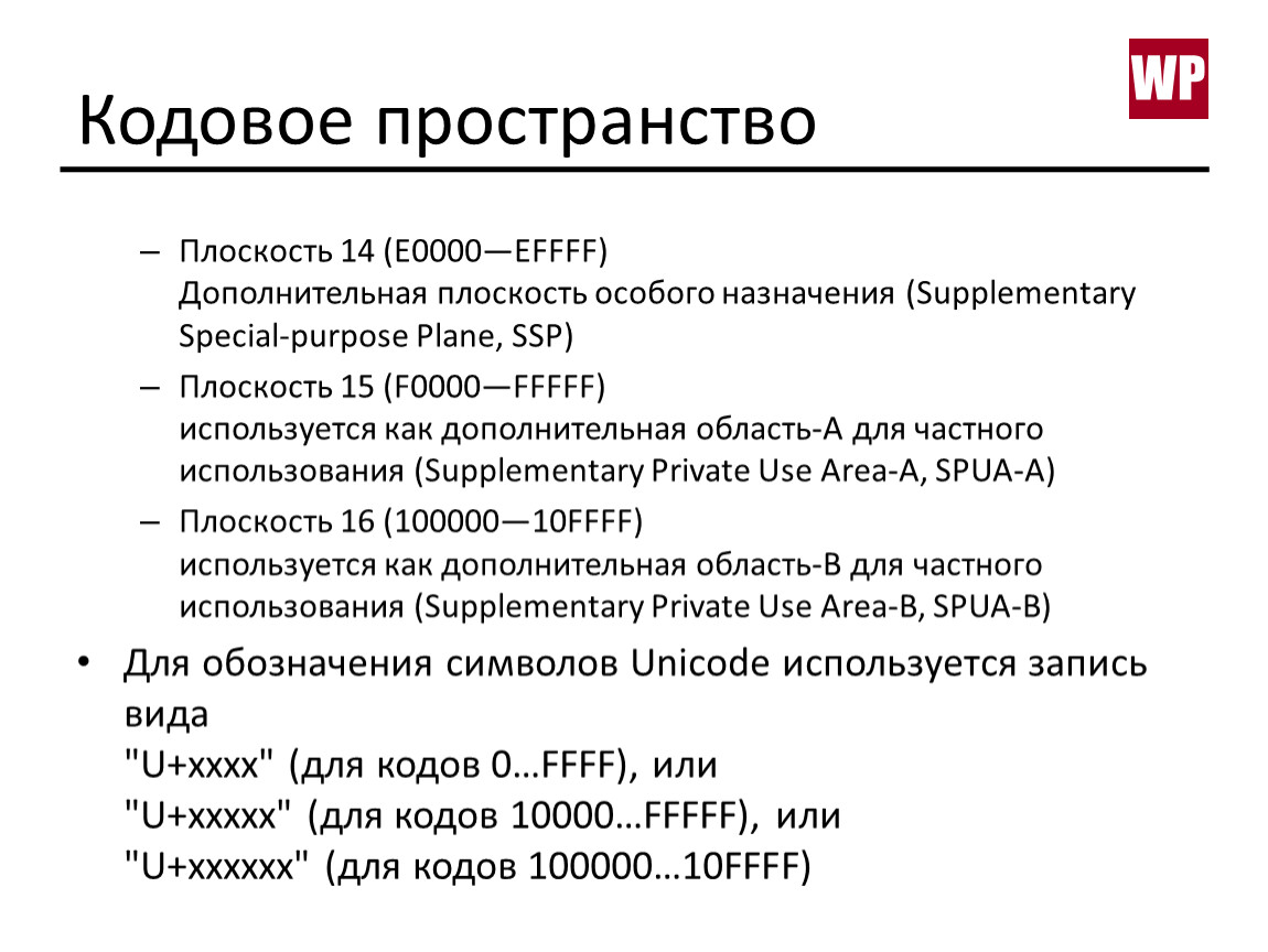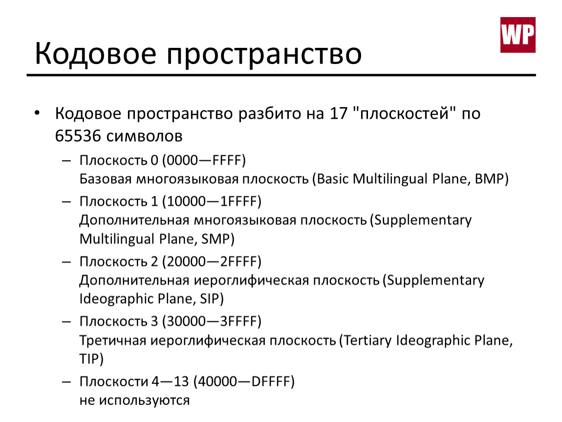 Кодовое пространство разбито на 17 "плоскостей" по 65536 символов