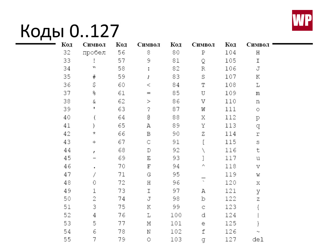Первая система кодирования ASCIIAmerican Standard Code for Information Interchangeсодержала 128 кодов символов (0..127): буквы латинского алфавита обоих регистров, цифры, математические операторы, знаки препинания и некоторые служебные символы (возврат каретки, знак табуляции и т.п.)