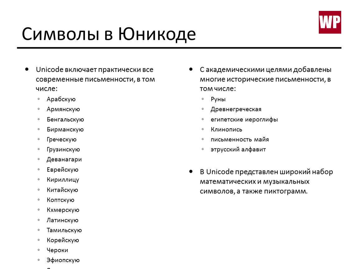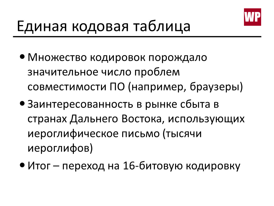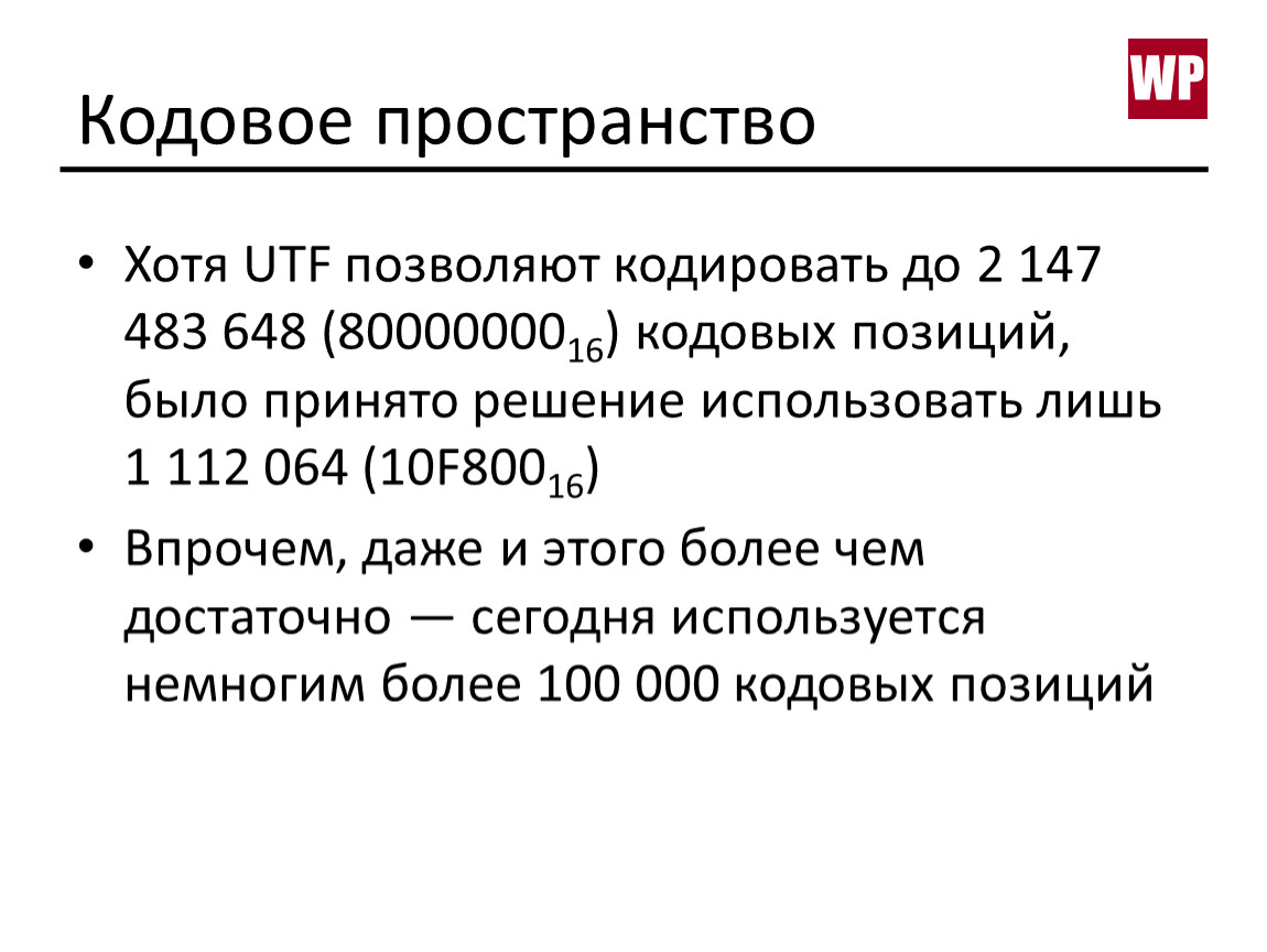 Впрочем, даже и этого более чем достаточно — сегодня используется немногим более 100 000 кодовых позиций