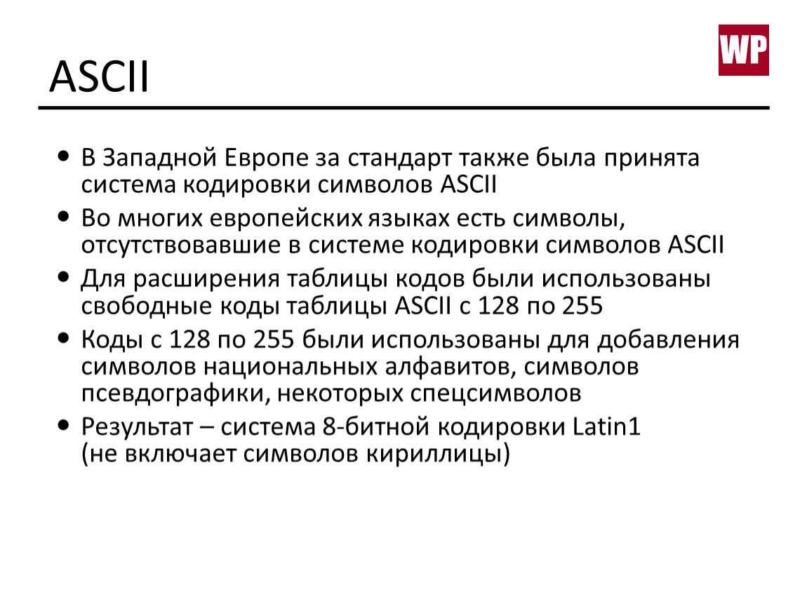 В Западной Европе за стандарт также была принята система кодировки символов ASCII