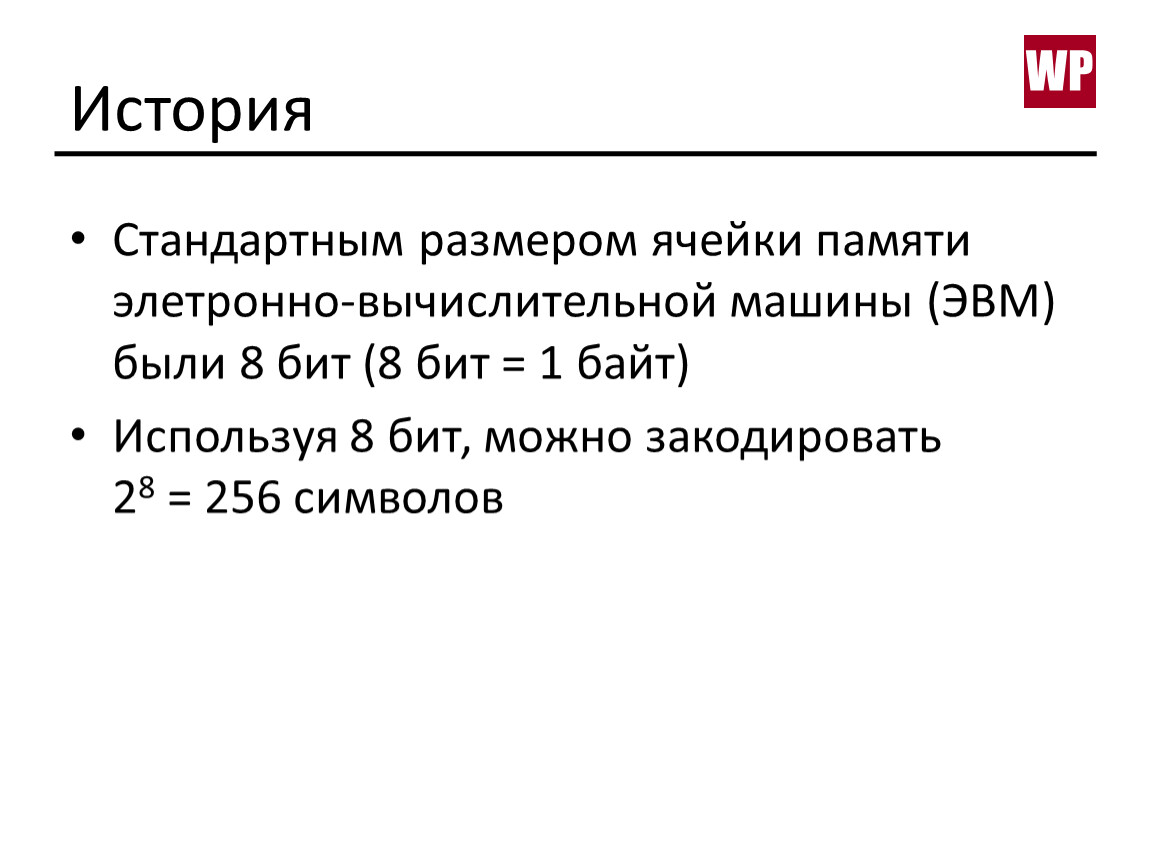 Стандартным размером ячейки памяти элетронно-вычислительной машины (ЭВМ) были 8 бит (8 бит = 1 байт)