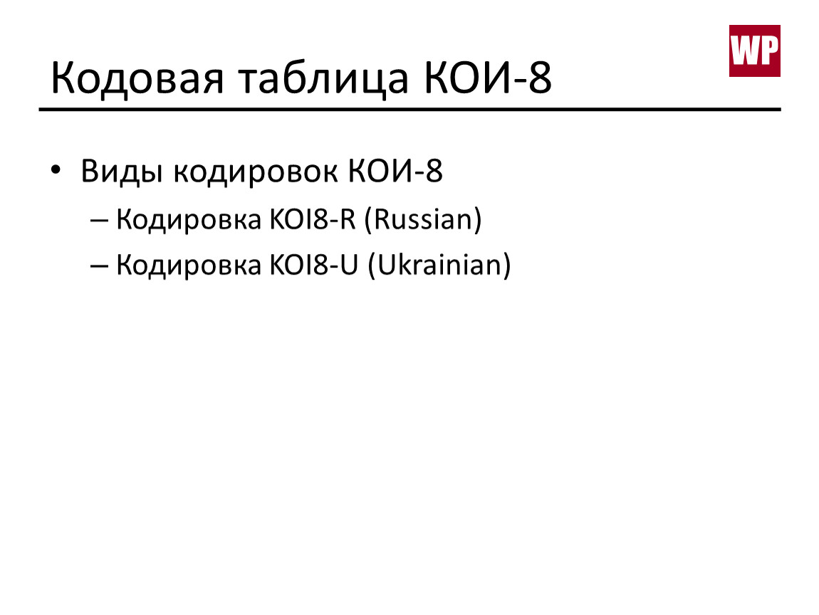 В кодовой таблице КОИ-8 символы русского алфавита помещены в расширенной таблице ASCII таким образом, что позиции кириллических символов соответствуют их фонетическим аналогам в английском алфавите