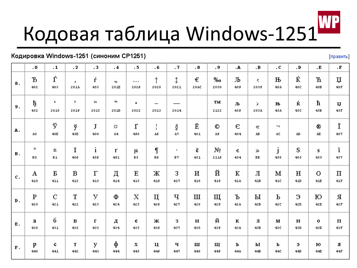 Windows-1251(синоним CP1251 – Code Page)набор символов и кодировка, являющаяся стандартной 8-битной кодировкой для всех русских версий Microsoft Windows