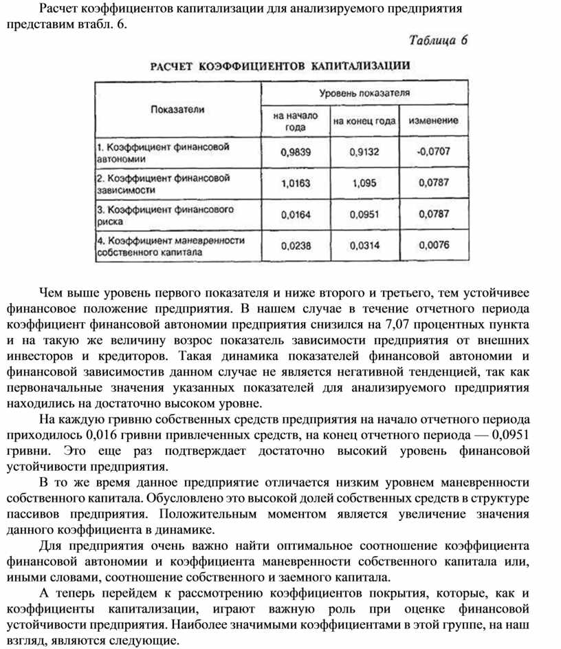 Расчет коэффициентов капитализации для анализируемого предприятия представим в табл. 6.
